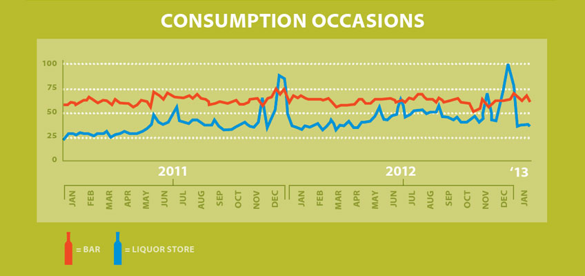 It is also possible to see that some occasions correlate more with off-premise purchase occasions than others. Certain times of the year provide more effective opportunities to push initiatives based around off-premise purchase and home-bar restocking.