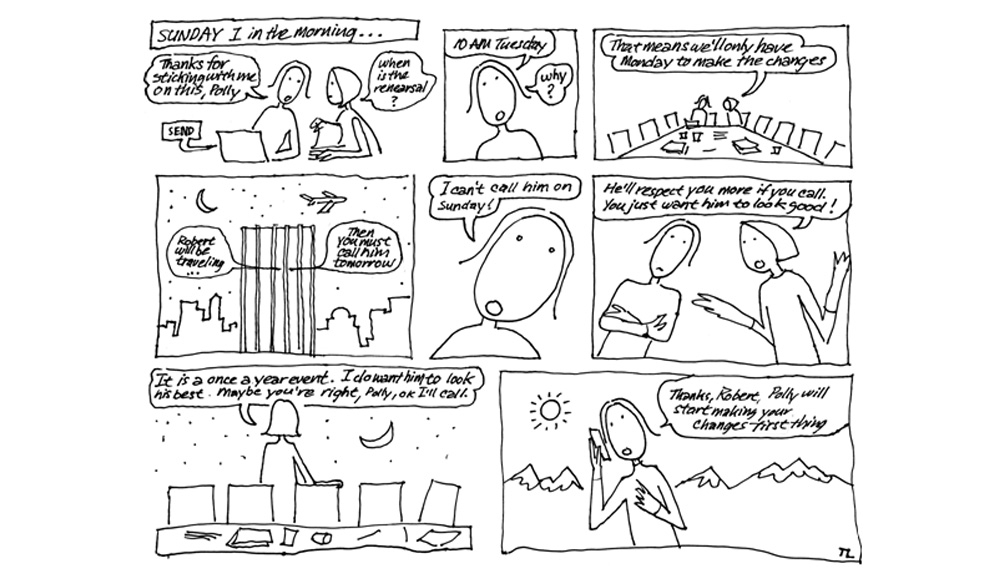 “Then, you need to call him tomorrow morning and ask him to closely review the deck. We need to get his comments as early as possible on Monday in order for him to look good for the rest of the team at Tuesday morning’s rehearsal,” Polly replied.