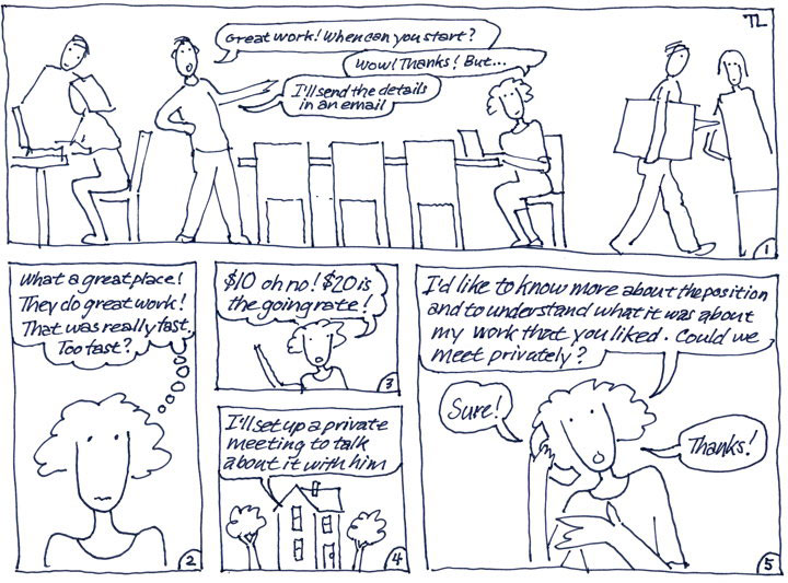 Her visit to the firm had been hurried. In the interview, conducted in the center of the open studio, Jim, the owner, had taken only 30 minutes to review her work. He seemed friendly enough, had praised her work, but a subsequent email had offered her only $10 an hour, substantially below the $20 to $25 that fellow design grads were getting at her university. The more she thought about the meeting, the more superficial she felt his praise was. Also, she’d gotten no answers to her questions about what she’d actually be doing if she took the position.