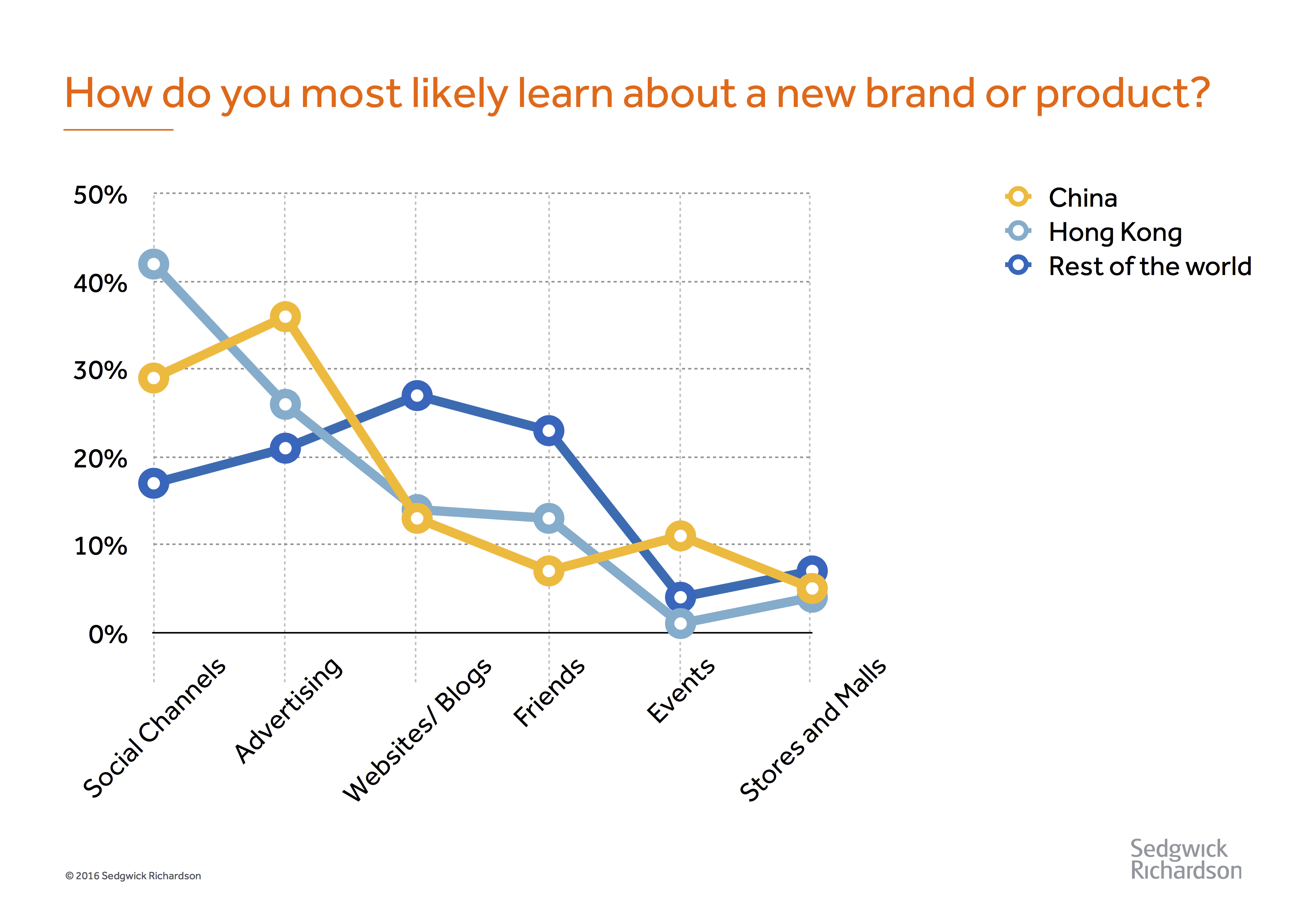 The answers are very revealing: Whereas multinational audiences (“rest of the world”) state that Websites/Blogs and Friends are the most important sources, Advertising is the most common source listed by Chinese respondents (closely followed by Social Channels). Websites/ Blogs and Friends, on the other hand, rank very low.