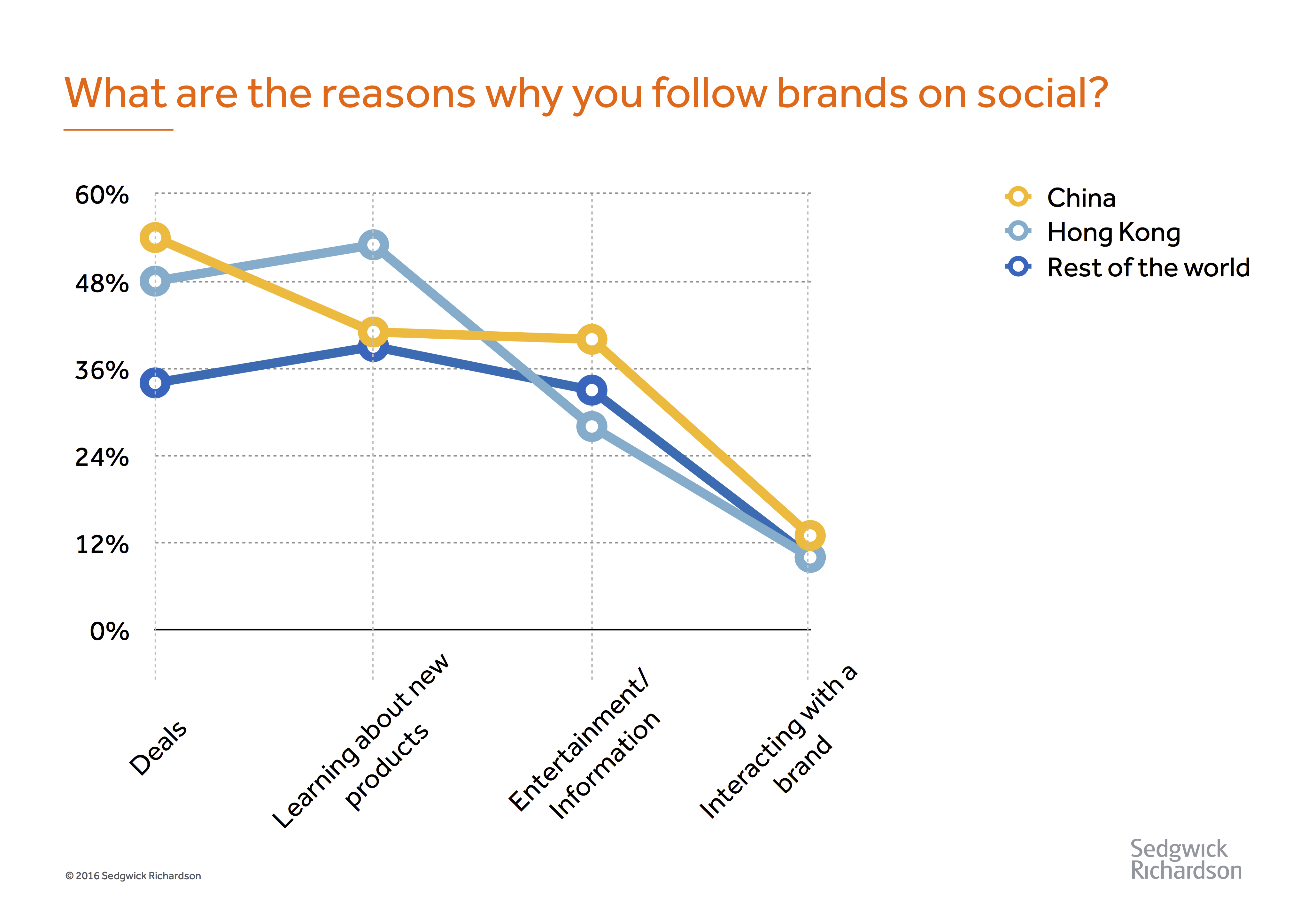 In other markets, and also in Hong Kong, consumers are less focused on bagging in bargains: only 34% of all multinational respondents state that deals are the key reason why they follow brands on social.