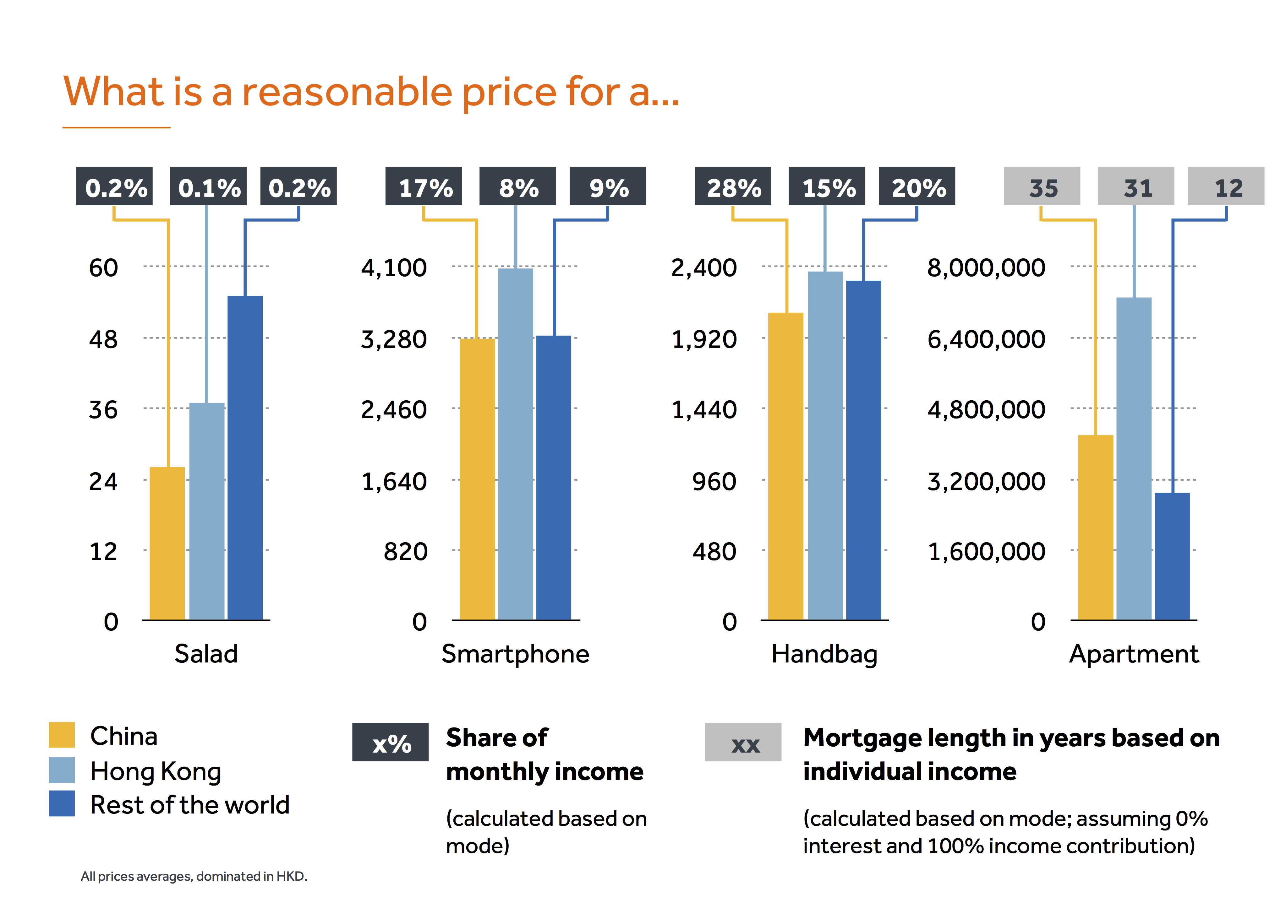 Chinese consumers deem 26 HKD a reasonable price for a salad, compared with 37 HKD for Hong Kong people and 55 HKD for multinational respondents. For smartphones and handbags, Chinese consumers are actually willing to spend almost the same amounts as consumers from around the world.