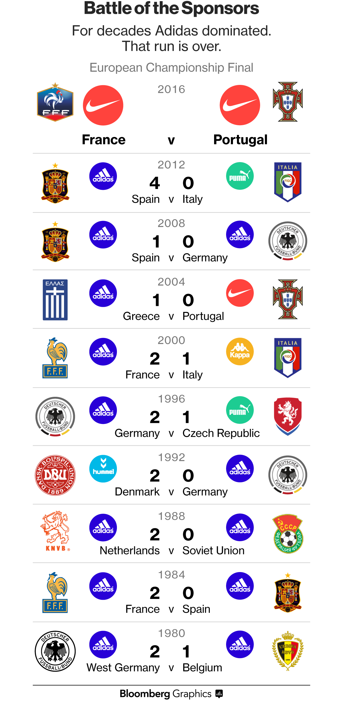 For the first time in three decades of modern sports sponsorship Adidas didn’t have a team playing in the European Championship final, while all 22 jerseys on pitch featured the swoosh logo. The fact that Adidas was one of the official sponsors of the tournament just makes it even worse.