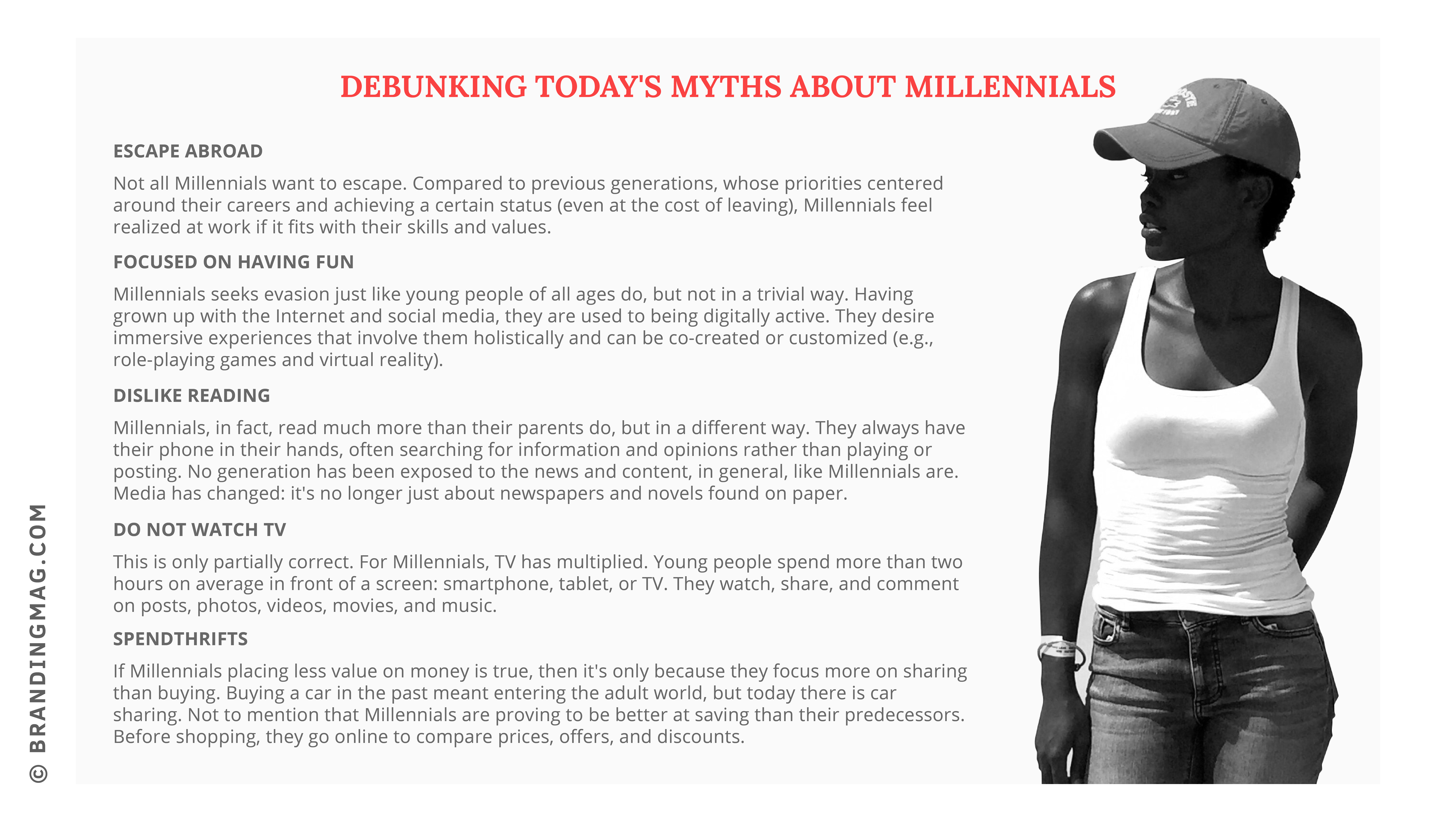 Although Millennials have been put under the magnifying glass, studied, psychoanalyzed, and crowned as the generation to bet on, marketers are still struggling to reach them. We limit our observation of them to when they are connected to the Internet, when they exchange opinions and data on social media, when they take selfies. The world of communication and marketing still seems trapped by stereotypes and false myths, risking to direct brands towards wrong and ineffective choices (see below).