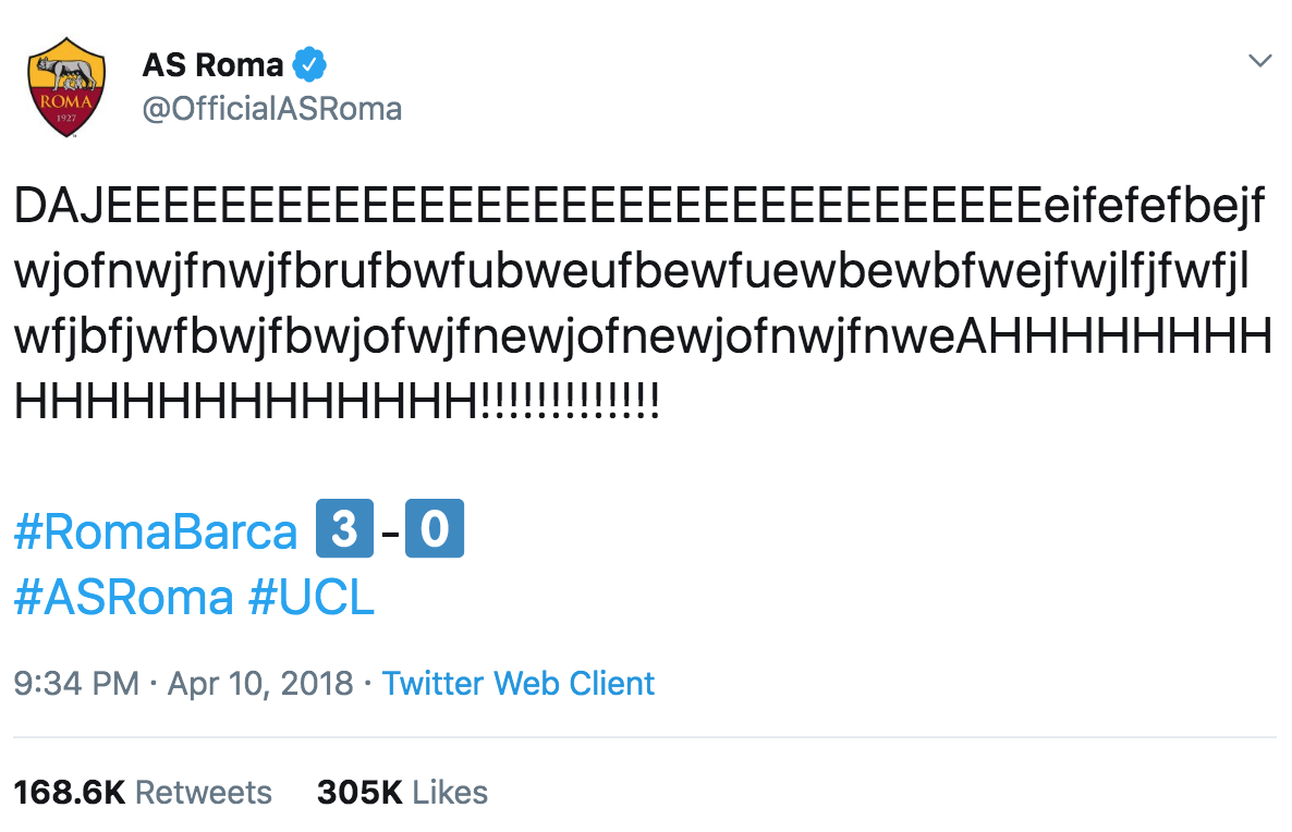 An example of this can be seen in a post which was shared on April 10th, 2018 – manic expressions were used heavily and the hashtags said it all. It was a game in which Roma had lost by 4-1 in the first leg, but won by 3-0 in the second run, thereby progressing to the next round. While the post seemed to be silly, it had accurately described what fans were feeling during the game – pure awe. The post received 305,000 likes and was retweeted 170,000 times – in fact, the AS Roma club managed to gain an estimated 180 million impressions.