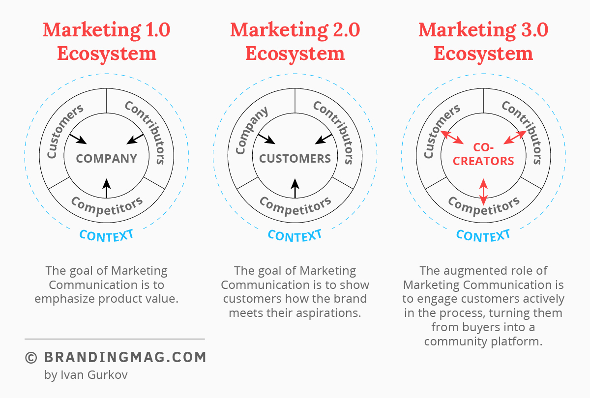 Accordingly, in the classification of Professor Philip Kotler, in Marketing 1.0, the business focus is on the product and the role of communication is to make a good product promotion. The value is in the superior product. Marketing 2.0 puts customer needs at the center and brings a humanistic understanding of the entire ecosystem. The role of communication here is to promote a strong brand based on emotional benefits and customer satisfaction. The value is shifted to the brand that meets the customer needs. Marketing 3.0 empowers customers and seeks their feedback and active participation, achieving better customer satisfaction while caring for their higher spiritual and social interests. Businesses and customers interact in synergy. The communication goals here are to engage customers in the marketing process, furthering their role in the business ecosystem, from product buyers to an active brand community. The value lies in collaboration, shared goals, and vision.