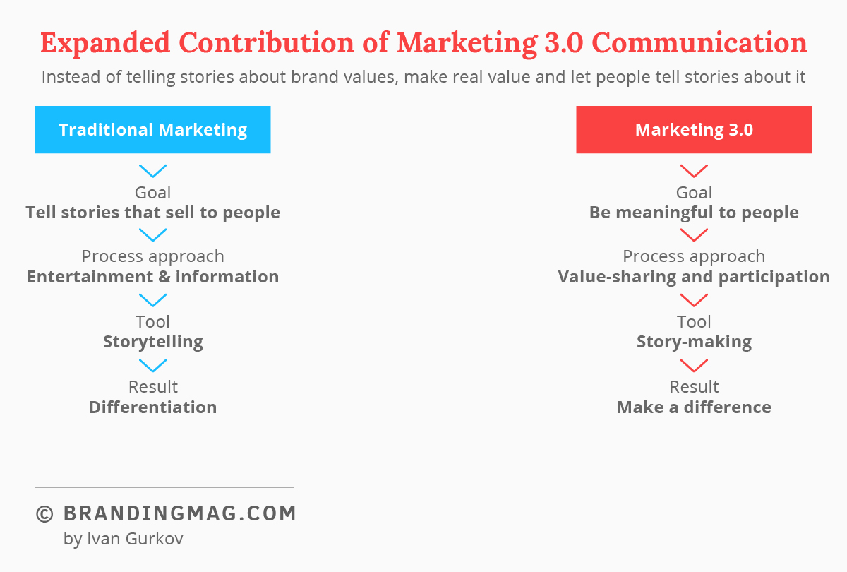 Marketing 3.0 communication builds coherency between the values and actions of the brand and the values and actions of its customers. The three levels, values-promises-actions of the company, must convey a united value message, which is expressed at every customer touch-point. It is a two-way transfer — the customer touch-points are also the points of dialogue and co-operation.