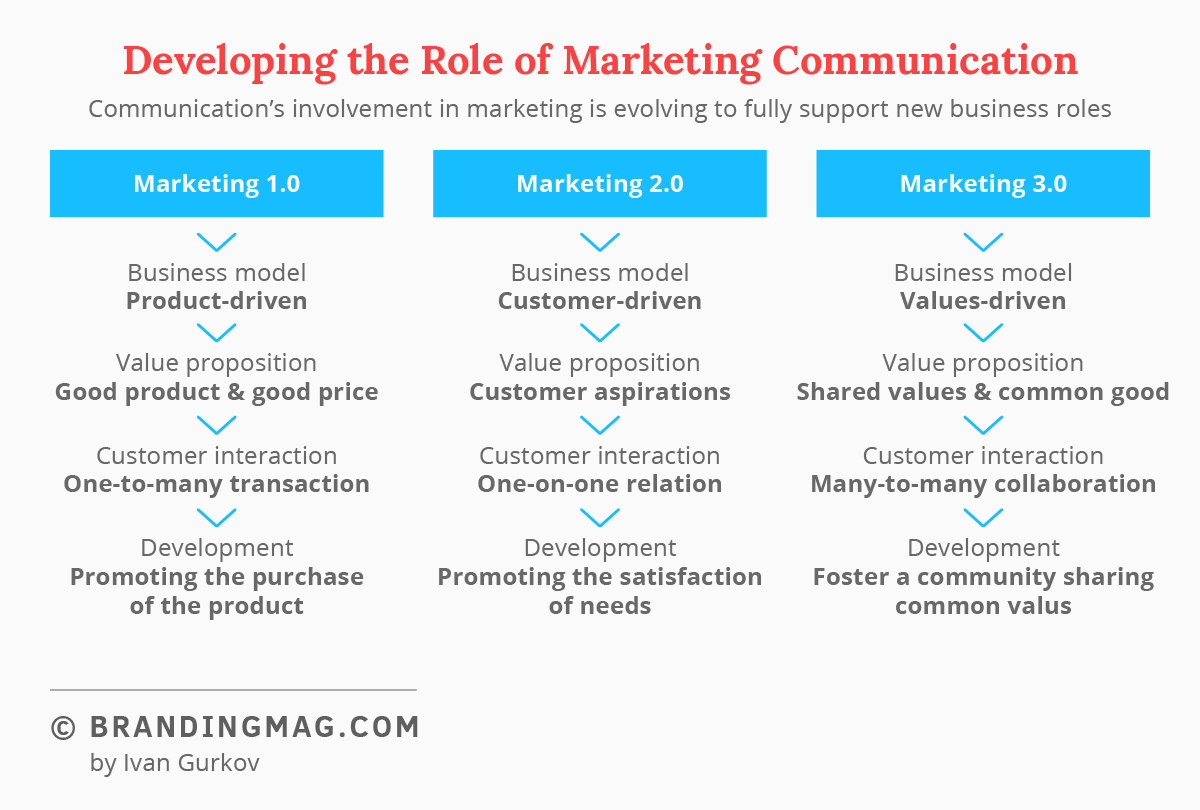 Accordingly, in the classification of Professor Philip Kotler, in Marketing 1.0, the business focus is on the product and the role of communication is to make a good product promotion. The value is in the superior product. Marketing 2.0 puts customer needs at the center and brings a humanistic understanding of the entire ecosystem. The role of communication here is to promote a strong brand based on emotional benefits and customer satisfaction. The value is shifted to the brand that meets the customer needs. Marketing 3.0 empowers customers and seeks their feedback and active participation, achieving better customer satisfaction while caring for their higher spiritual and social interests. Businesses and customers interact in synergy. The communication goals here are to engage customers in the marketing process, furthering their role in the business ecosystem, from product buyers to an active brand community. The value lies in collaboration, shared goals, and vision.
