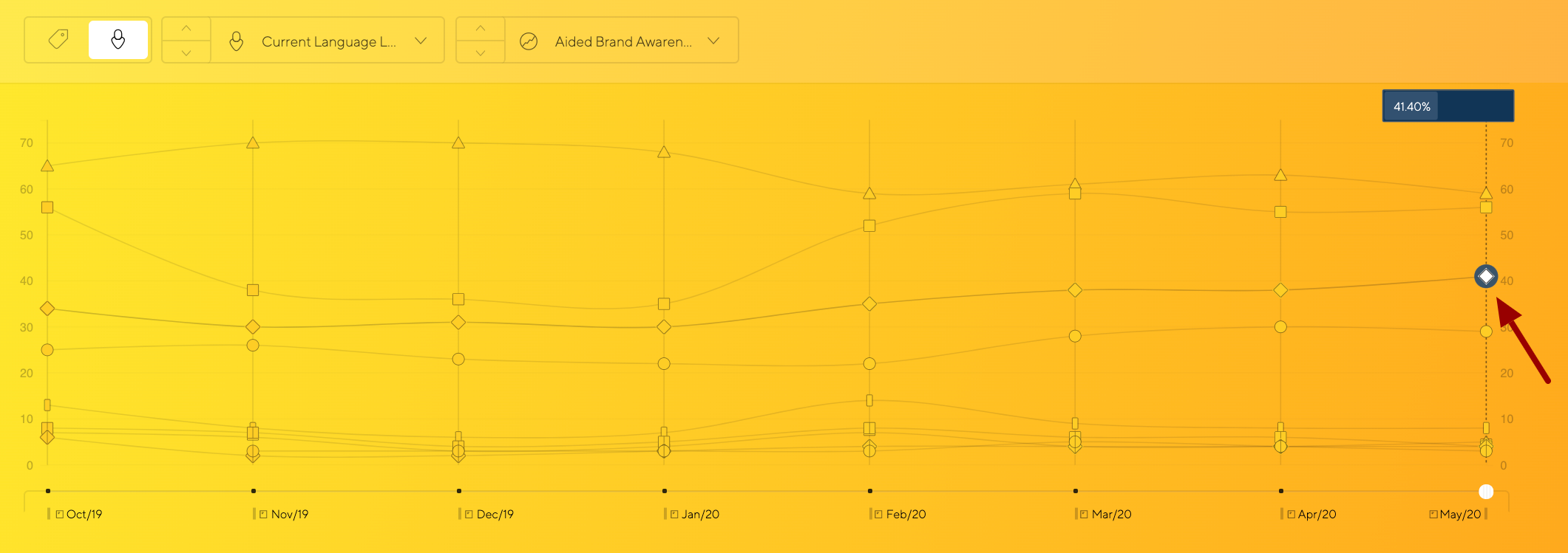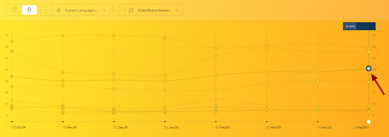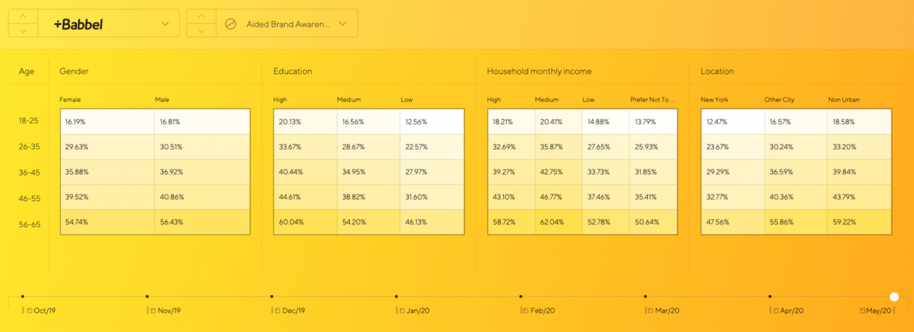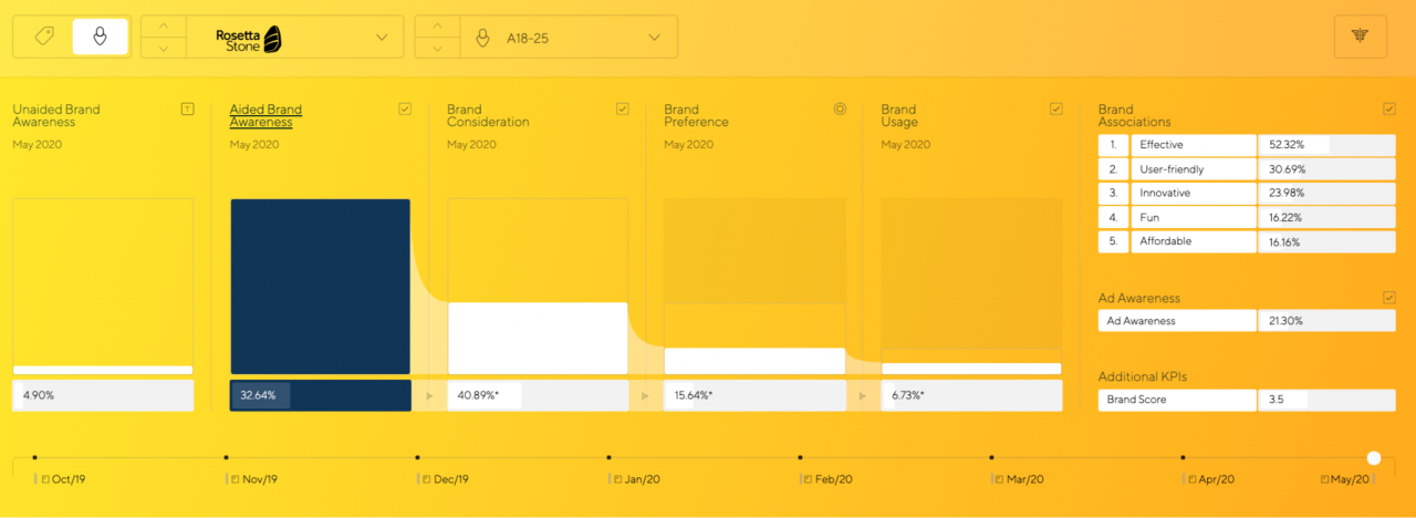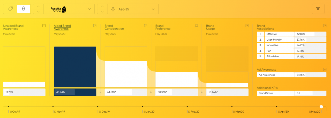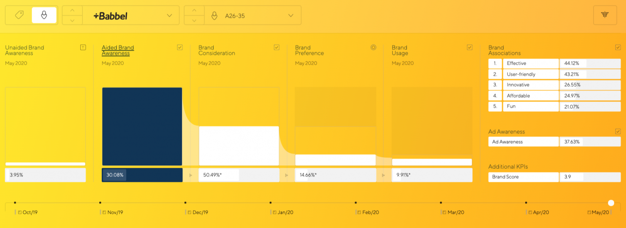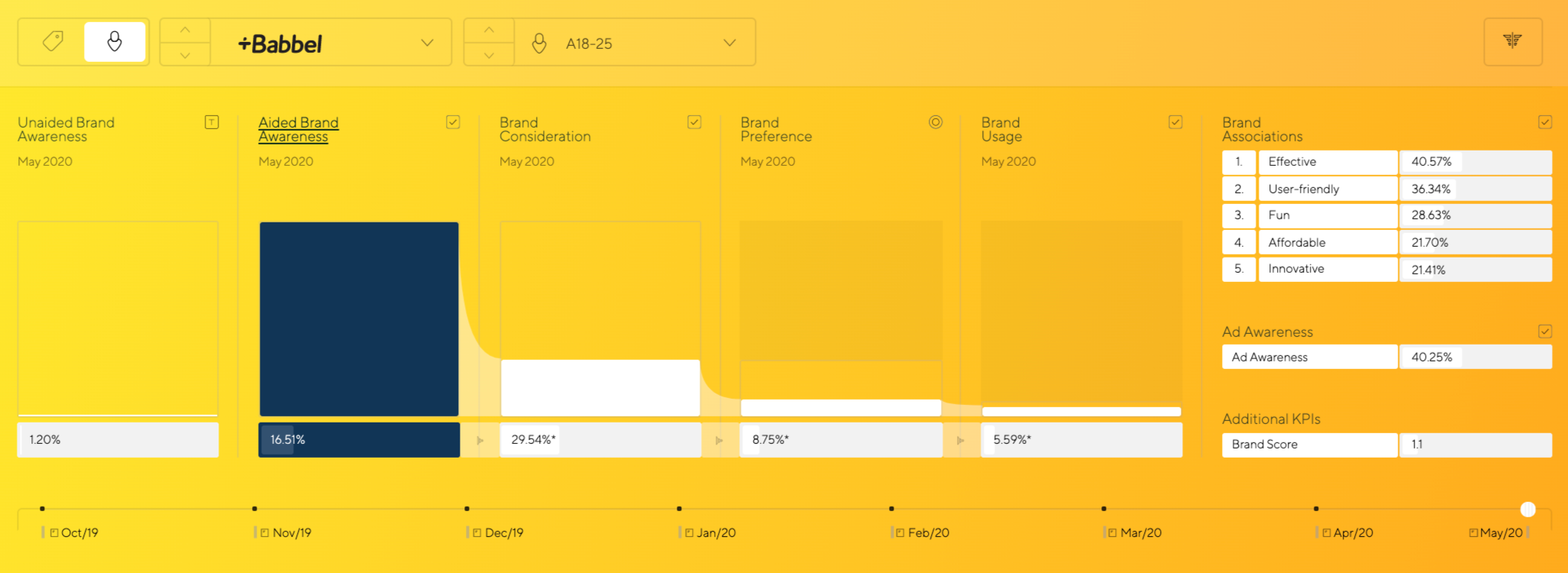 If you want to scale growth for your brand, you need to accurately determine which brand activities worked and which didn’t. This helps in making better marketing decisions in the future and being able to concentrate on what is best for your brand. Let’s have a look at the chart below, that follows Babbel’s brand awareness amongst current language learners from October 2019 to May 2020 and determine what that could mean for them.
