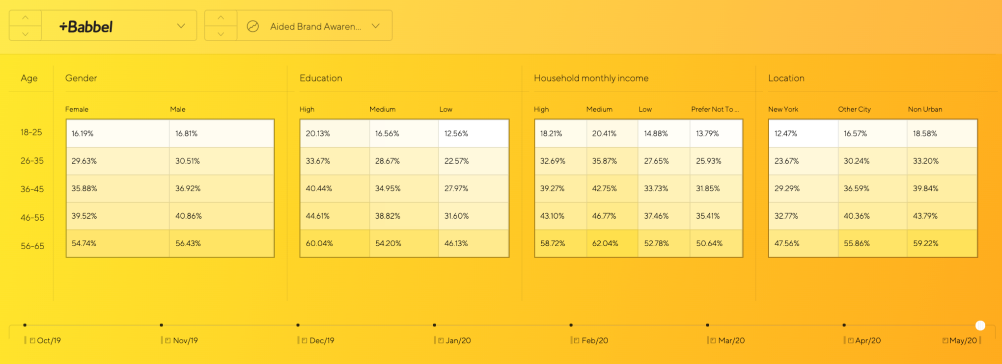 A heatmap can help Babbel see where patterns emerge around specific audience characteristics that increase or decrease over time. By using the heatmap above we were able to see that the biggest trend in brand awareness is around the 56-65-year-old age group. Digging down further, Babbel’s brand awareness hits its peak with 56-65-year-olds with a medium household monthly income (62%). The 56-65-year-olds with a high level of education are not far behind (60%).
