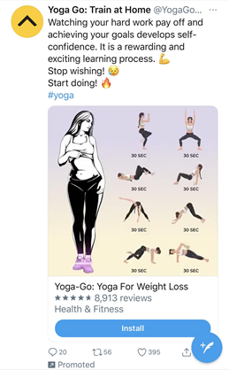 - Placement: In an age where people talk about targeting and personalization, not one of these adverts is directly, or even indirectly, relevant to me or what I use Twitter for. This is not an issue with advertising these products to me – they could all be made relevant. I need to go to the shop and buy some lunch after writing this, I could certainly benefit from doing some yoga, and I have a nephew with an Xbox who I’ll need to buy a present for soon. You could sell me all these products but not with these adverts delivered via Twitter.
