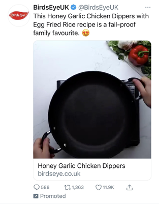 To be entirely fair, this is a video ad and if you wait 30 seconds you do see the chicken dippers. However, on Twitter, when I am not looking for cooking content the chances of me viewing the ad for 30 seconds are not high. Especially, when what I see in my feed is an empty dish – what I do is keep on scrolling.