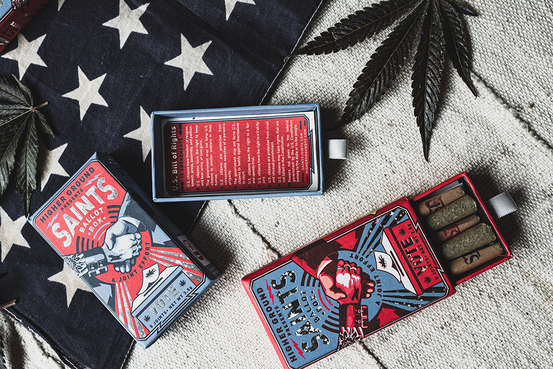 MS: Can I choose all of the above? For Higher Ground, the projects need to be communal and uplifting. (Which, not surprisingly, is the kind of strain I like – chatty!) Our brand design and artistic execution are crucial to all our projects. Part of the reason we teamed up with Saints on our Higher Ground Ballot Box, was because they are an upscale company that shares our vision. They understand that cannabis brands – and consumers – want to do more than just get as high as possible. They want to participate in progressive action. They want organic products. They also want beautiful things. Together, we used the Ballot Box project as a platform to spark engagement, and register new voters. It also put folks in a damn good mood leading up to Election Day.