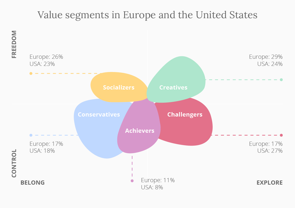 For instance, we know that progressive parts of society, such as the earlier mentioned Creatives, are significantly more likely to translate the above trends into buying behavior than, for instance, the Socializers – sociability seekers who love entertainment, freedom, and family values.
