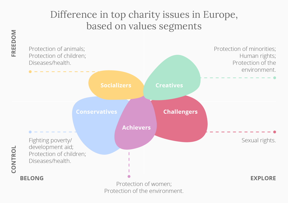 In addition, clearly not every target audience is passionate about the same purpose issues. Creatives and Socializers, in Europe, have quite different issues they typically care about. For example, Creatives are more into the protection of minorities, human rights, and the environment, while Socializers are more into protection of animals, children, and combatting disease.