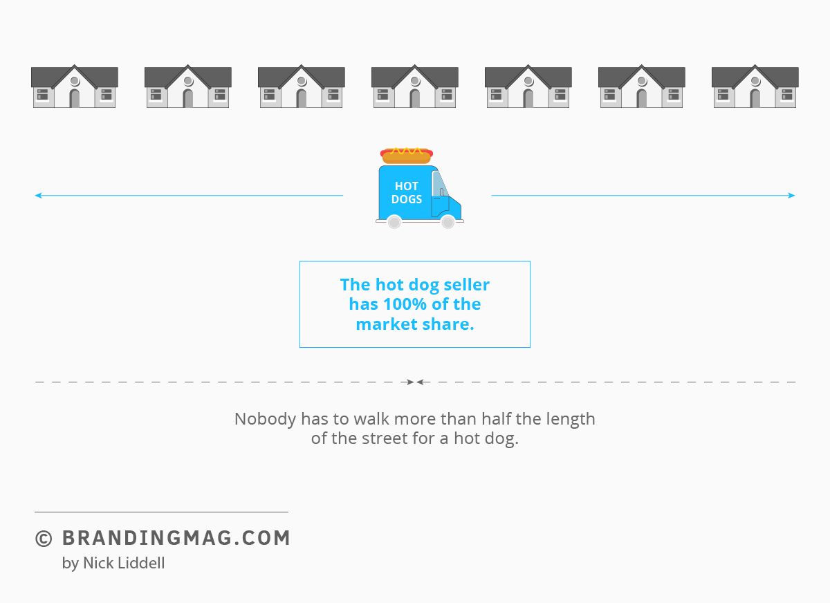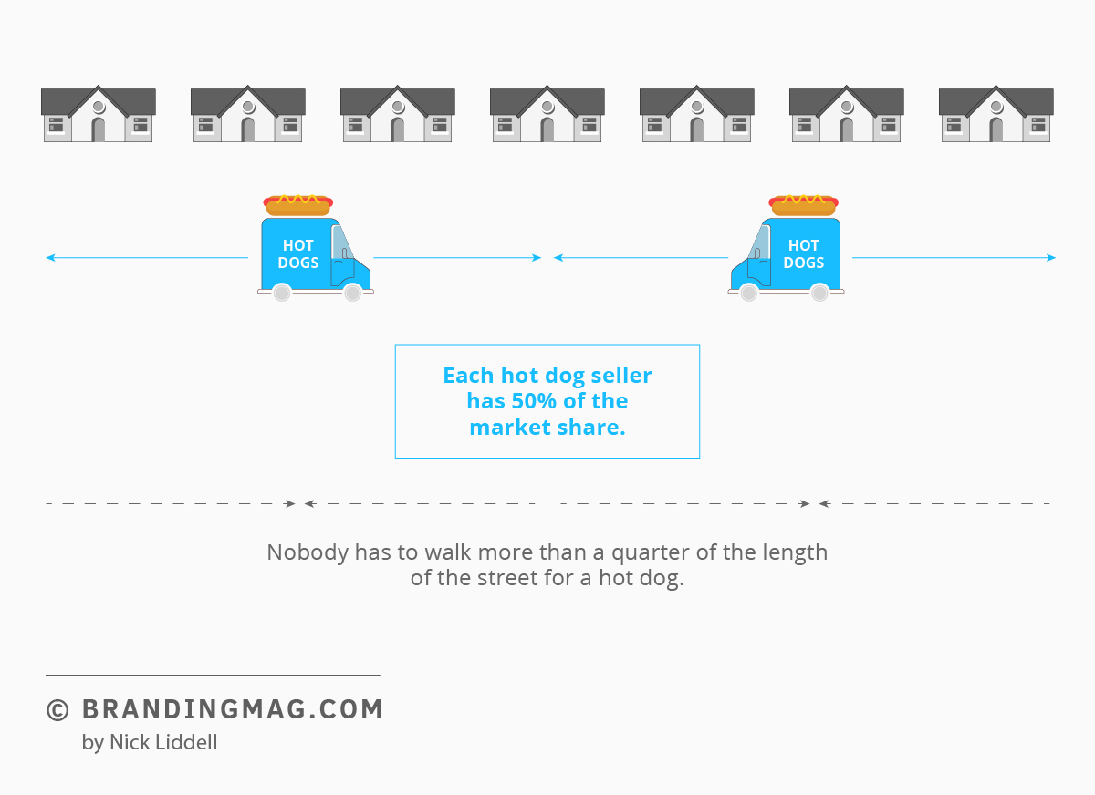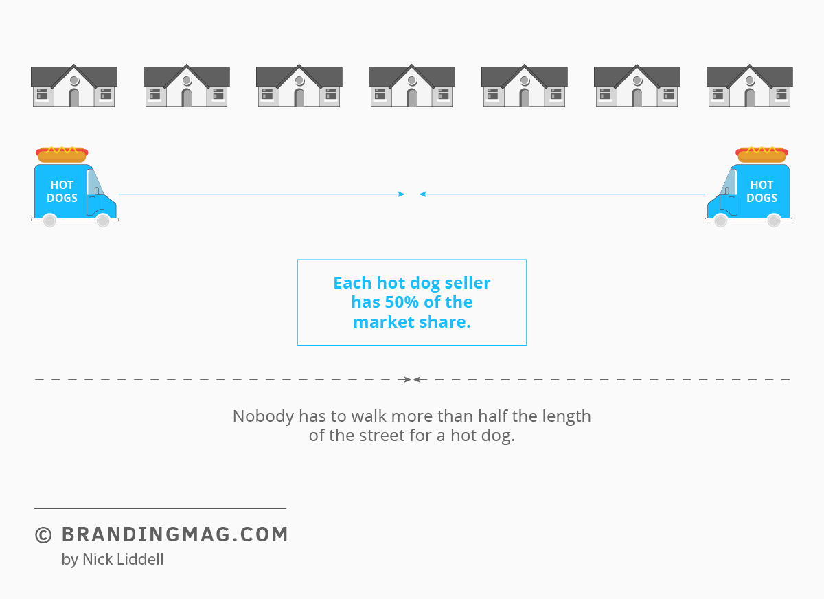 This is where Hotelling’s law comes in. Let’s imagine our entrepreneurs begin at opposite ends of the street. If they stay there, each gets half of the market and nobody has to walk more than half the length of the street to get a hot dog.