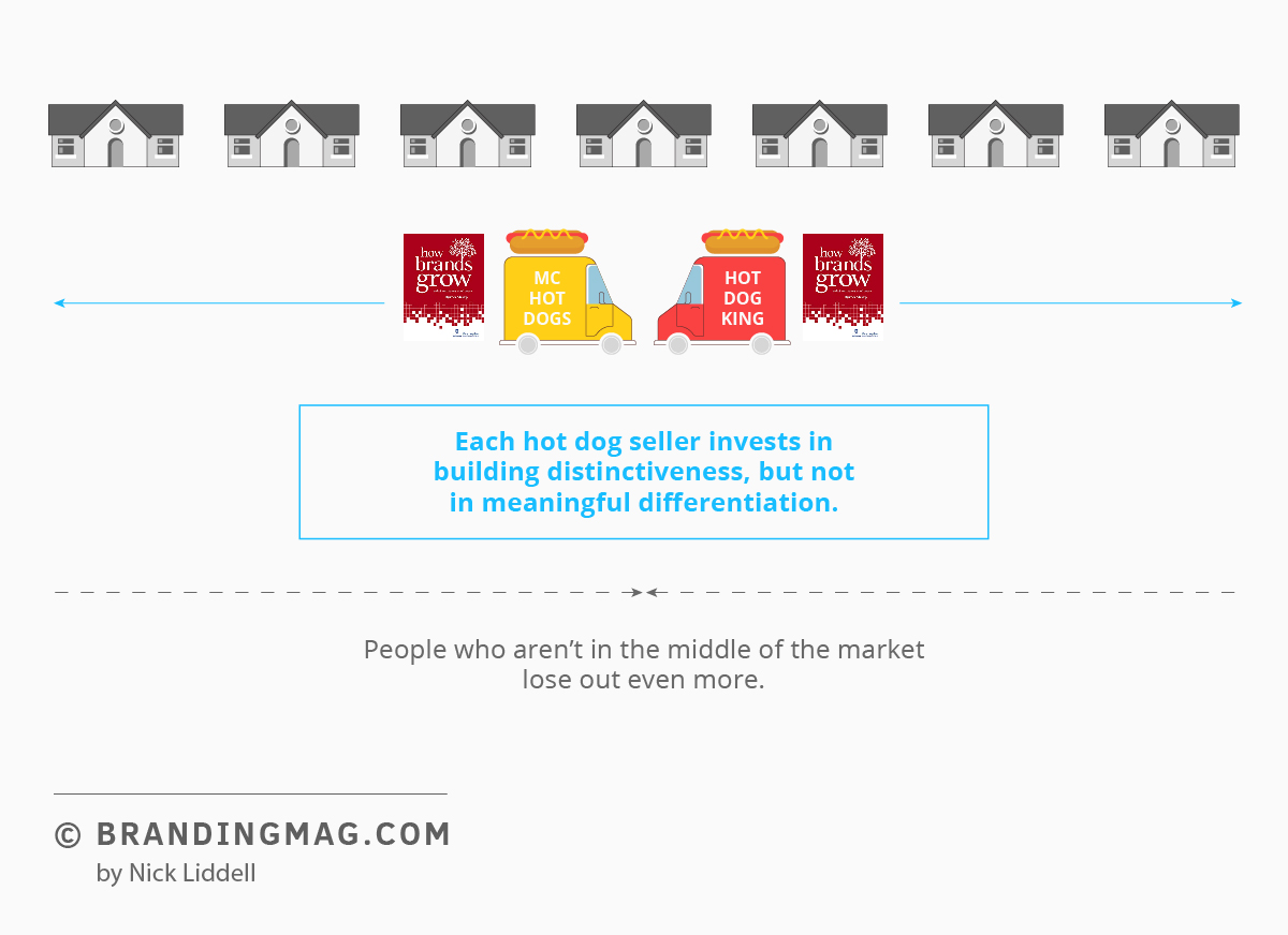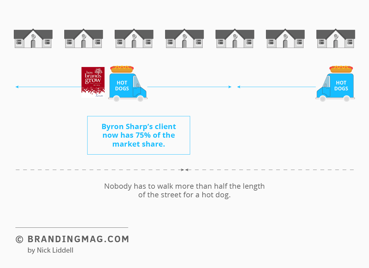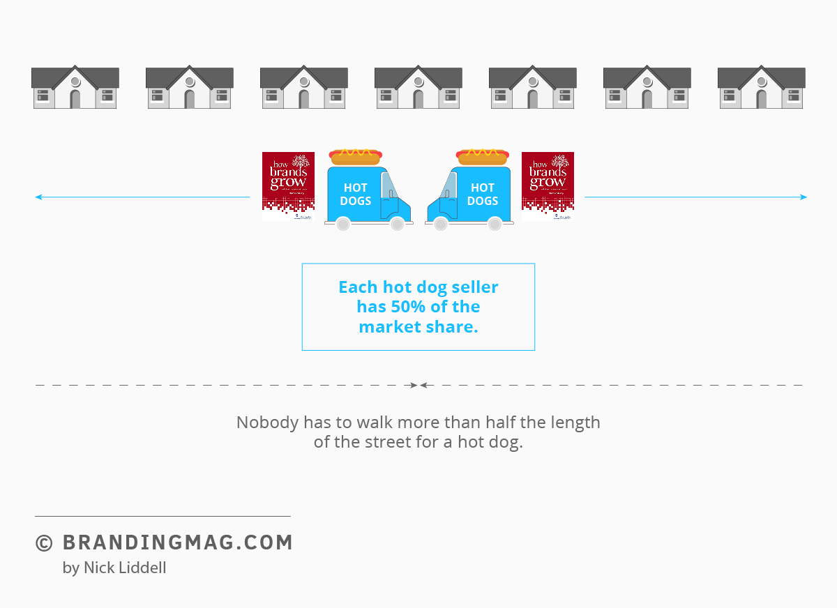 If both hot dog entrepreneurs follow Byron Sharp’s advice, they will engage in a race to the middle. The net result will be no different for each entrepreneur than if they had stayed at their end of the street: Both hot dog stands reach 50% of the market and the furthest anybody has to travel to buy a hot dog is half the length of the street.