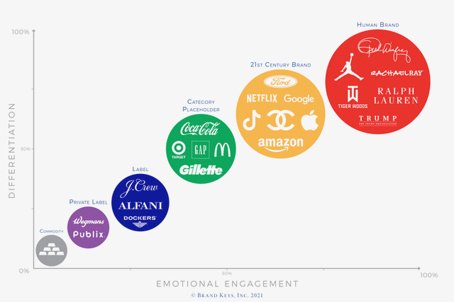 The degree of “brandness” (consumer emotional engagement potency) escalates as one migrates from left to right on the chart. As brand differentiation increases, the sector rises. It’s true one can be profitable as a “label”, and fortunes can be amassed in “commodities”, but that still doesn’t qualify them as “brands”.
