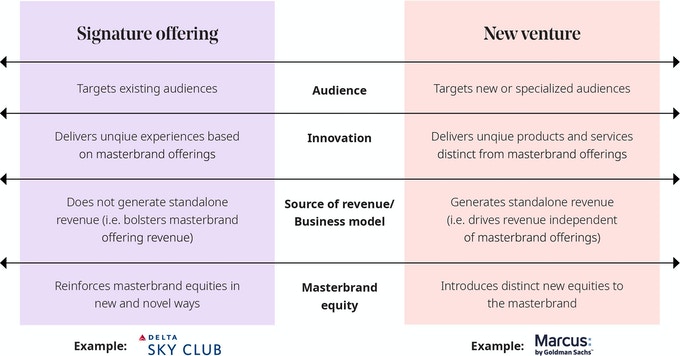 In contrast, signature offerings are innovative and differentiated offerings, whose value transcends any specific master brand product or service. They may comprise of a discrete product, service, feature, or experience, and unlike a new venture, they do not drive stand-alone revenue. The revenue they generate is either incremental and dependent on the sale of a core master brand offering.