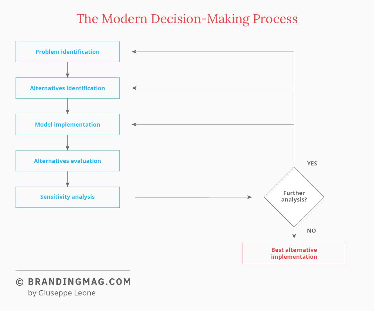 We thus come to the modern decision-making process. The process has been studied for a long time in the literature. In figure 1, the main steps are illustrated.