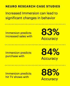Immersion is a neurological state based on one’s relative level of attention and emotional connection. When people are highly immersed, they are paying attention, emotionally engaged, and actively committing information to memory. In other words, they are ‘in the zone,’ or in a ‘flow state’. This means an experience is resonating with them on a fundamental level. In fact, to the point, it can predict future behavior. These fully emotionally committed states are the times when a brand is most likely to be able to create a positive and recalled experience.