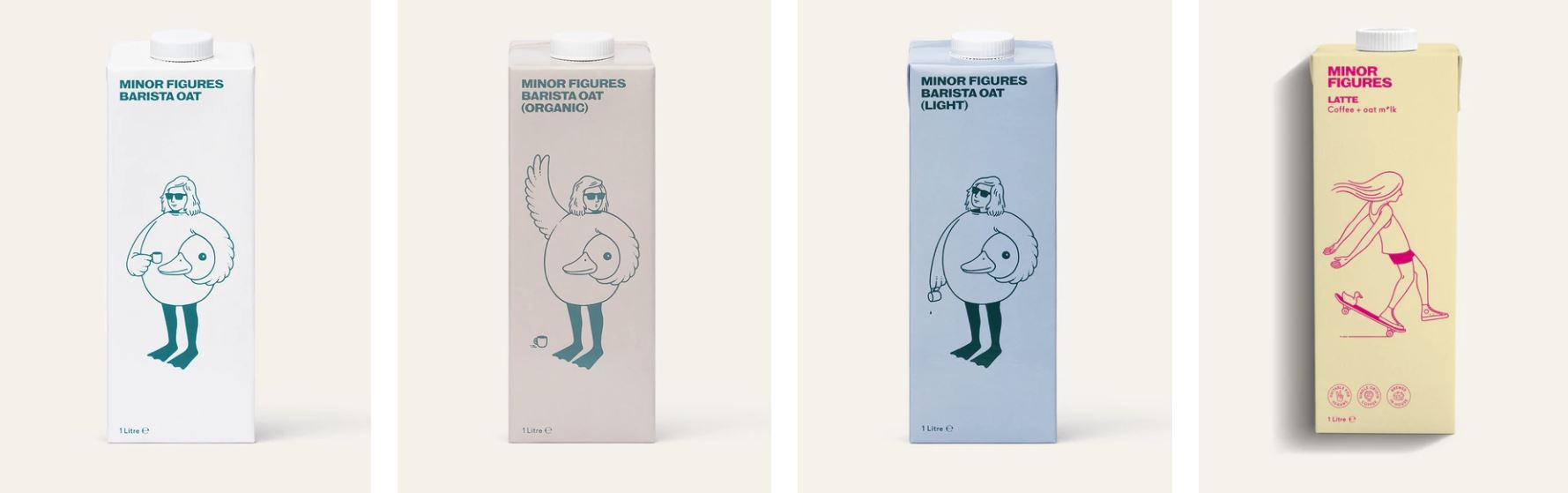 A fun, contemporary brand may look to the latest trends for inspiration and have multiple graphics for each product. For example, hip barista favorite Minor Figures has a uniquely simple yet cool packaging design that features different graphic characters in pastel colors for a product that stands out on the shelves among more traditional milk cartons and bottles.