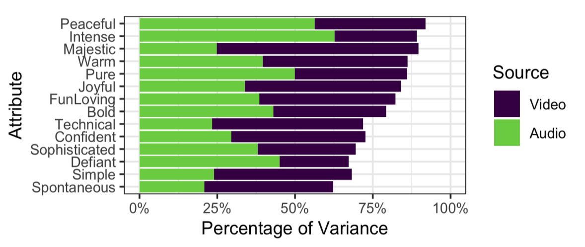 Diving a little deeper into the research, when we test the same audio against multiple visual scenes we can calculate the percentage of variance explained by both the audio and aggregated videos for each semantic attribute. By using this approach, the variance explained by audio is between 20.8-62.7%, depending on the attribute.
