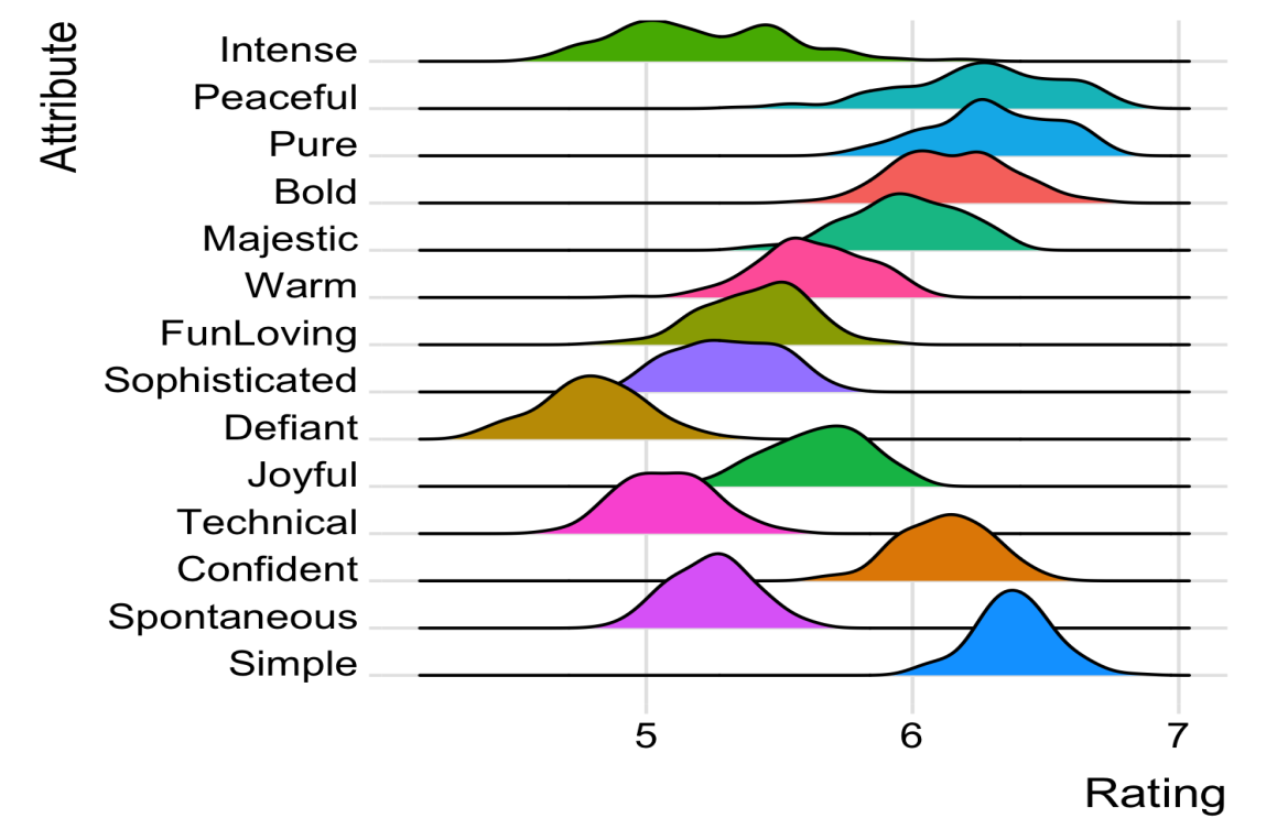 As the diagram below shows, the ability of audio to move emotional perception with music differs according to the attribute. This graph provides an effective way of assessing how effective music can be in influencing the perception for any given attribute. As shown, some attributes (e.g., Intense) show much more variance than others (e.g., Simple), indicating they are easier to manipulate with audio.