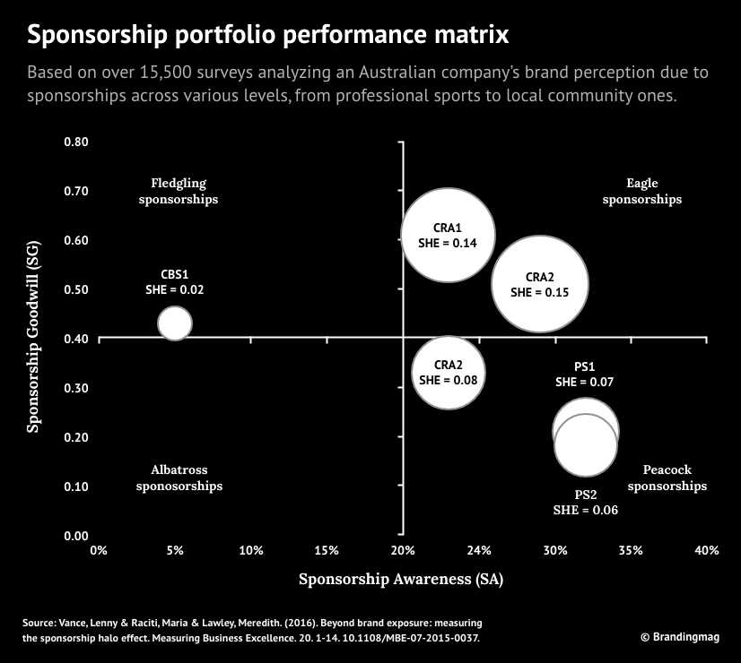The researchers leveraged their results to develop a four-quadrant matrix framework categorizing sponsorships as “eagle” (high awareness/high goodwill), “peacock” (high awareness/low goodwill), “albatross” (low awareness/low goodwill), or “fledgling” (low awareness/high goodwill) to enable sponsorship comparison across a portfolio.