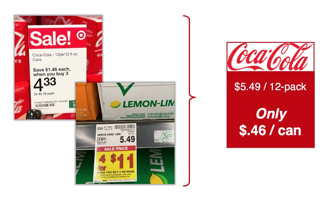 Think of mental math as the accounting required to “solve for” the amount of savings, which is frustrating to the brain. Consider the example below: On the left you have some promotional prices for Coke and Sprite.