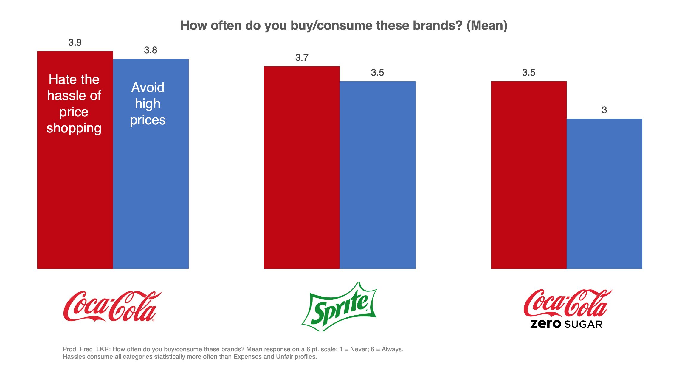 This assessment is measured in a unique way, capturing self-perception of usage. So, in the above, a person who consumes Coca-Cola frequently (1 = “never” consume, 6 = “always” consume, so 3.9 represents regular / frequent usage) is most hindered by the hassle of price shopping (the red). Whereas someone who consumes it slightly less is hindered simply by high prices (the blue). And the gap is wider for Sprite and Coke Zero.