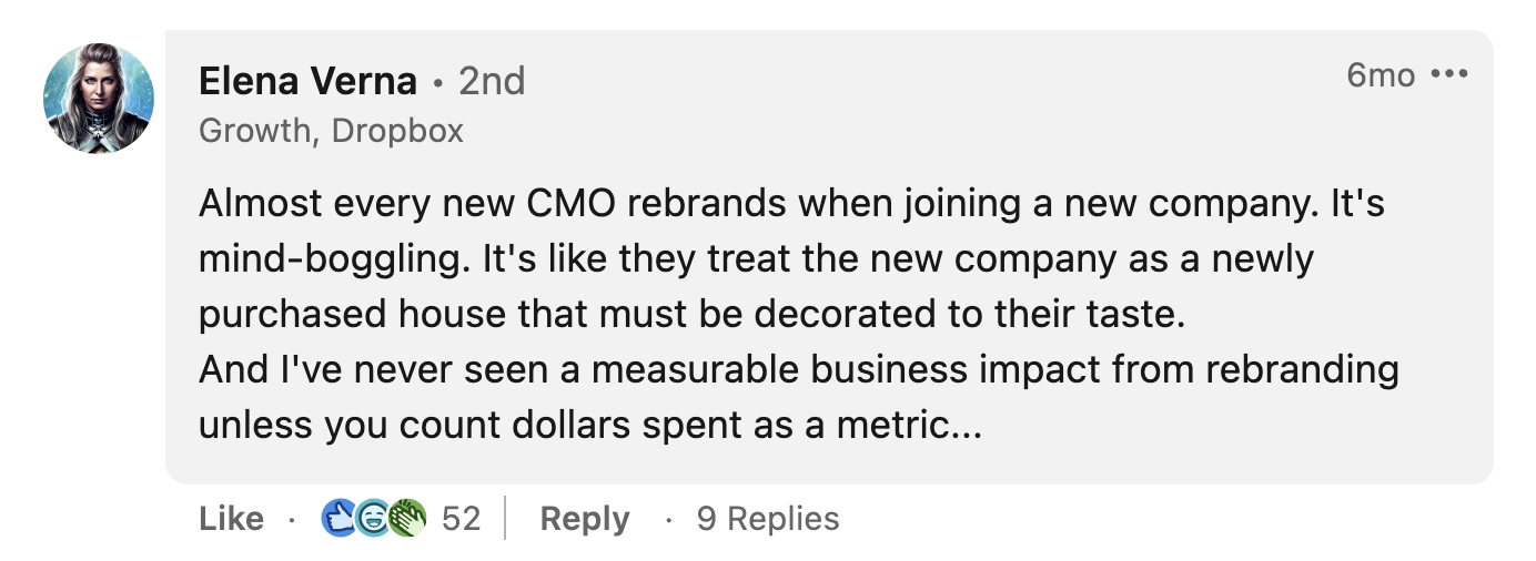 These overblown rebrands usually happen because someone has a personal agenda and wants to make a statement. They’re either bored, don’t know what to do, want to gain visibility, or just want to funnel money to a friend’s agency. Either way, rebrands are a great distraction and stall tactic, making them a favorite of new heads of marketing (see step 6 here for details).