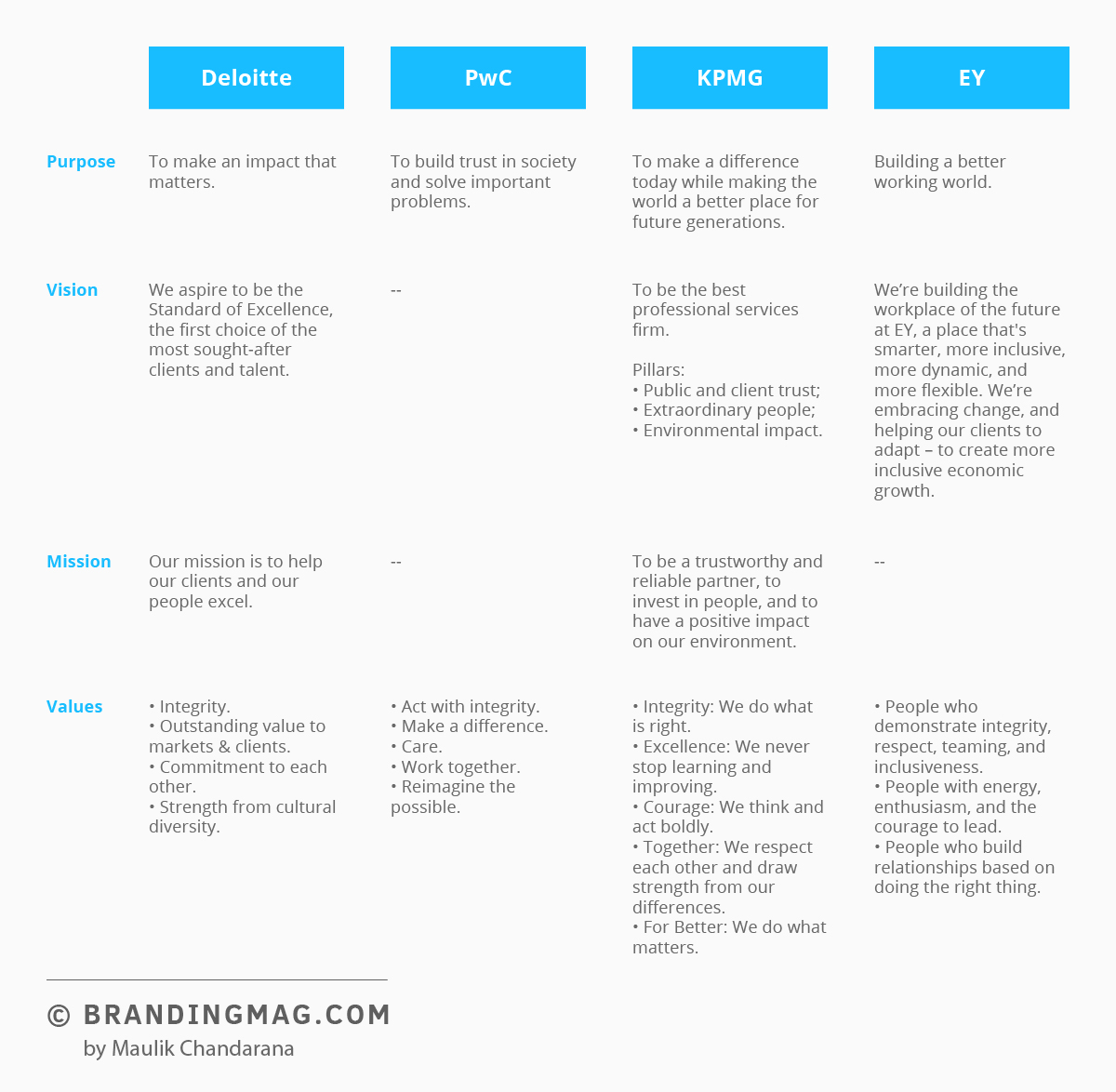 To sum up, plainly put, Deloitte, EY, PwC, and KPMG – the Big 4 – are businesses in the professional services space. But seeing them comparatively reveals interesting insights, especially for newer firms. Also, there’s a glimpse of their narratives turning human and creative – as B2B businesses worldwide are being goaded to become ‘unboring’. Most importantly, there is an opportunity to be single-minded and simple-minded when it comes to new firms defining and distinguishing themselves.