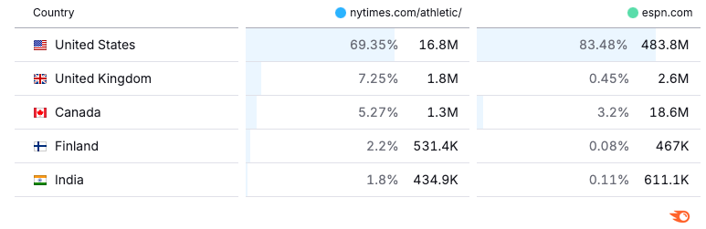That’s all the more clear when you look beyond ESPN’s North American audience. In the UK, ESPN.com has only 800k more site visitors than The Athletic, and the gap narrows as you start looking around the world.