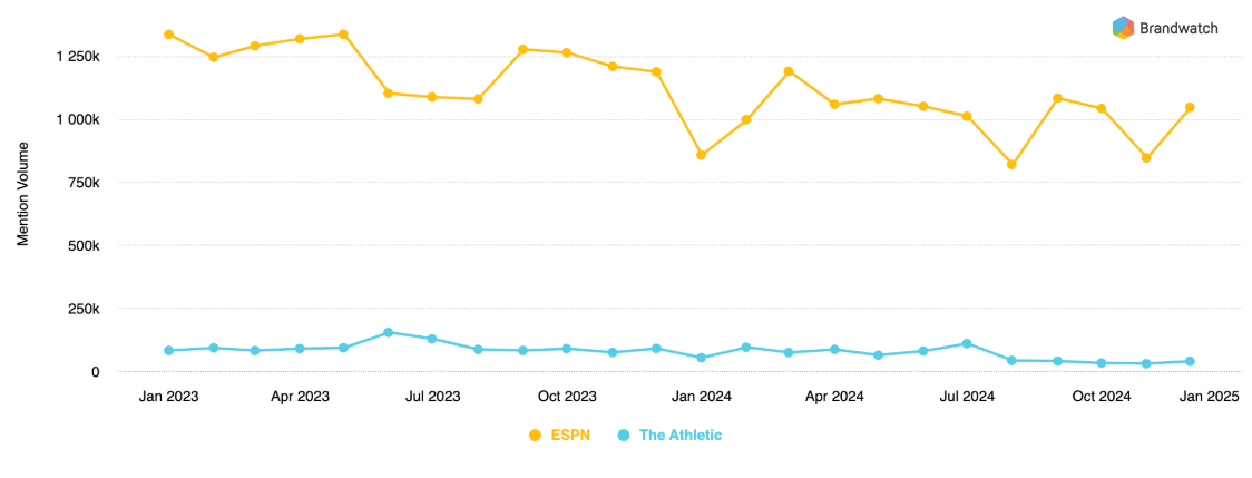 Yet, something interesting is happening on social media: Between January 2023 and 2025, for example, ESPN’s total mentions across social platforms went noticeably down (see chart below). As were The Athletic’s.