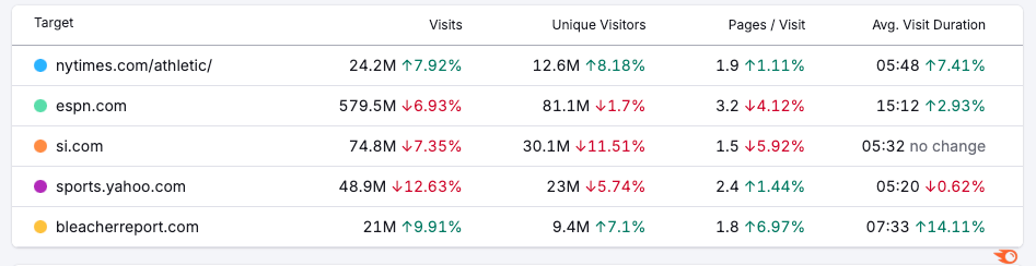 Judging by these analytics, if it weren’t for average website visit duration, ESPN would be on a downward trend across all of its key performance indicators. And it’s likely the reason why this one metric is green is more because of live game streaming and less because of anything brand-related.