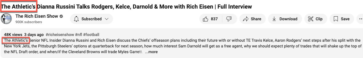For whatever it’s worth (which is questionable), I ran this for ESPN and The Athletic using two popular syndicated sports programs that host content on YouTube: Dan Patrick and Rich Eisen. Why these two? Because they are extremely popular, deeper than most of these sorts of shows, and both used to work at ESPN.