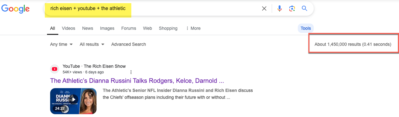 Again, all I did was run a query like dan patrick show + youtube + espn and compared the total number of Google results to those resulting from a query like dan patrick show + youtube + the athletic.