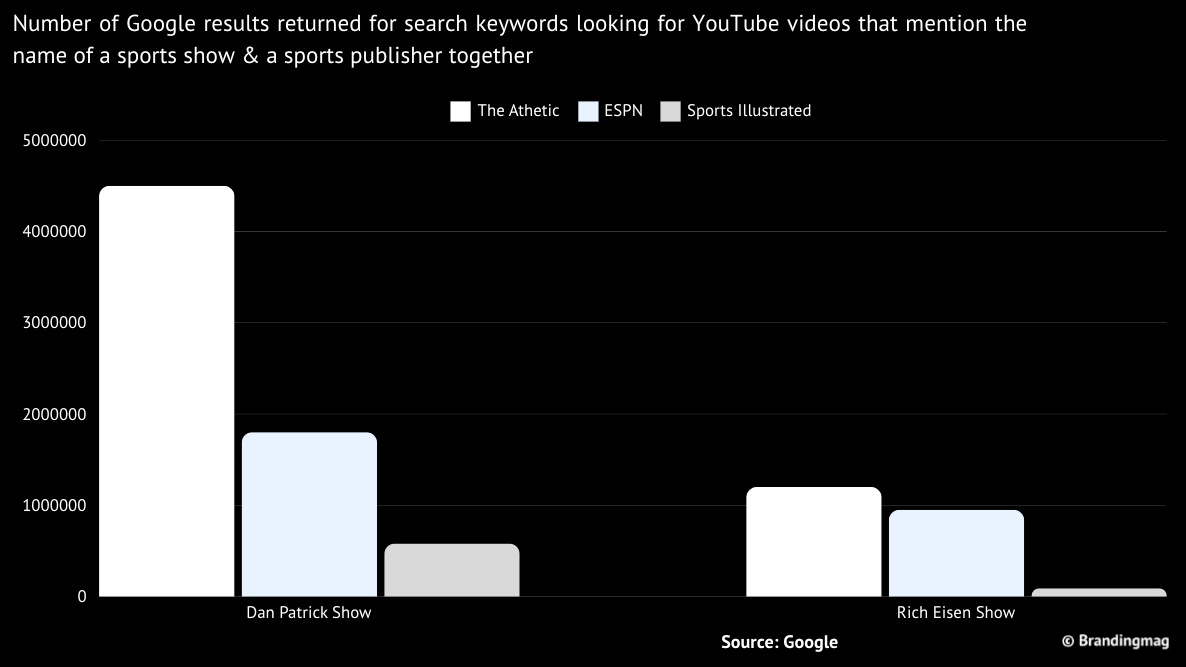 It’s not even close. Despite their ties to ESPN, both shows pull up far more results on Google for The Athletic. In the case of the Dan Patrick Show, we’re talking two million more results.