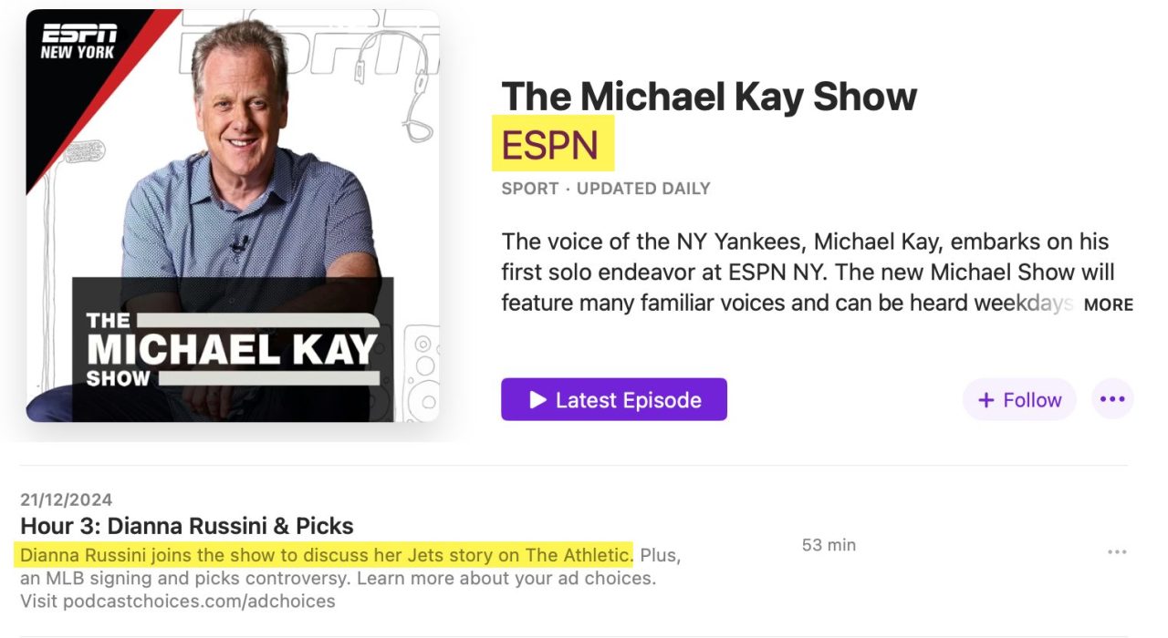 Still, it’s hard for me to show you what I mean since I assume you don’t consume hours of sports radio. (Ironically, I listen to ESPN Radio’s New York vehicle a lot). What I can attempt to show you, however, is just how often The Athletic is quoted on some of the industry’s most important outlets.
