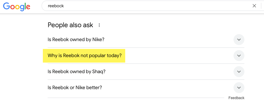 For many Google searches, the search engine displays a little box of commonly asked questions that users are asking. When you expand the tab to see an answer to the question, additional questions load. This way, it becomes a rabbit hole that helps you understand how people relate to a brand (among other things).