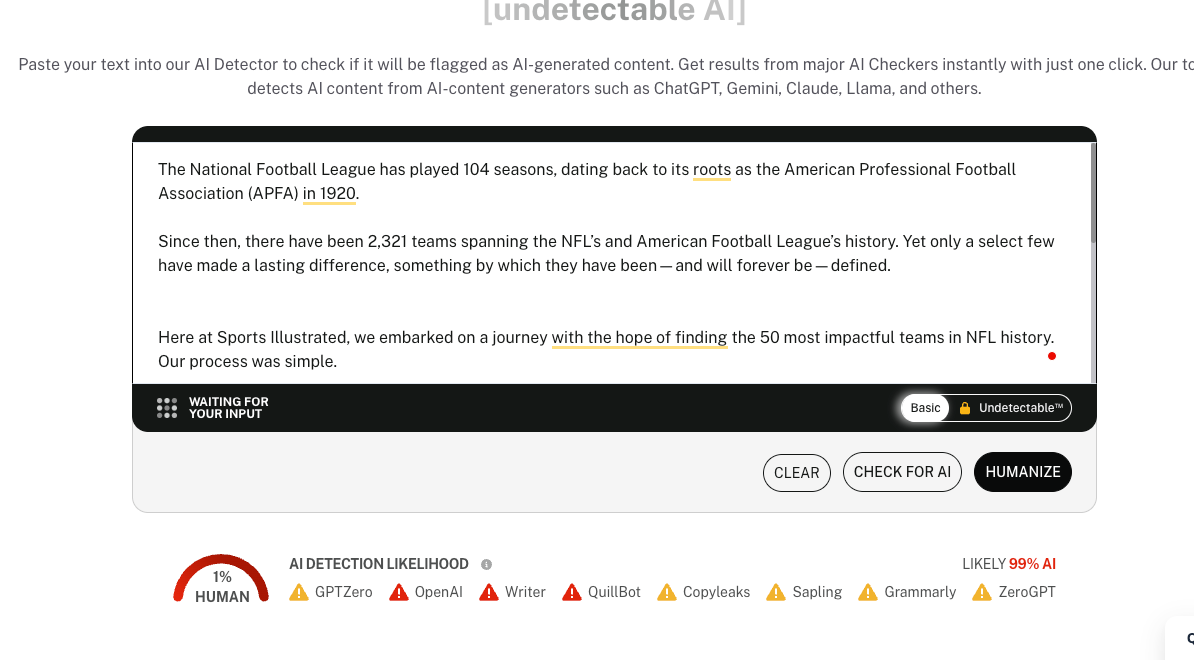 According to AI detection tools, Sports Illustrated is still possibly using AI to generate content. It doesn’t matter if the tool is accurate or not; you can still see in their articles how the outlet tries to get around detection, relying heavily on large sections of quotes to counteract the AI content used. It’s all a bit nefarious. To me, this is a bit nefarious, considering how the outlet tried to get around detection.