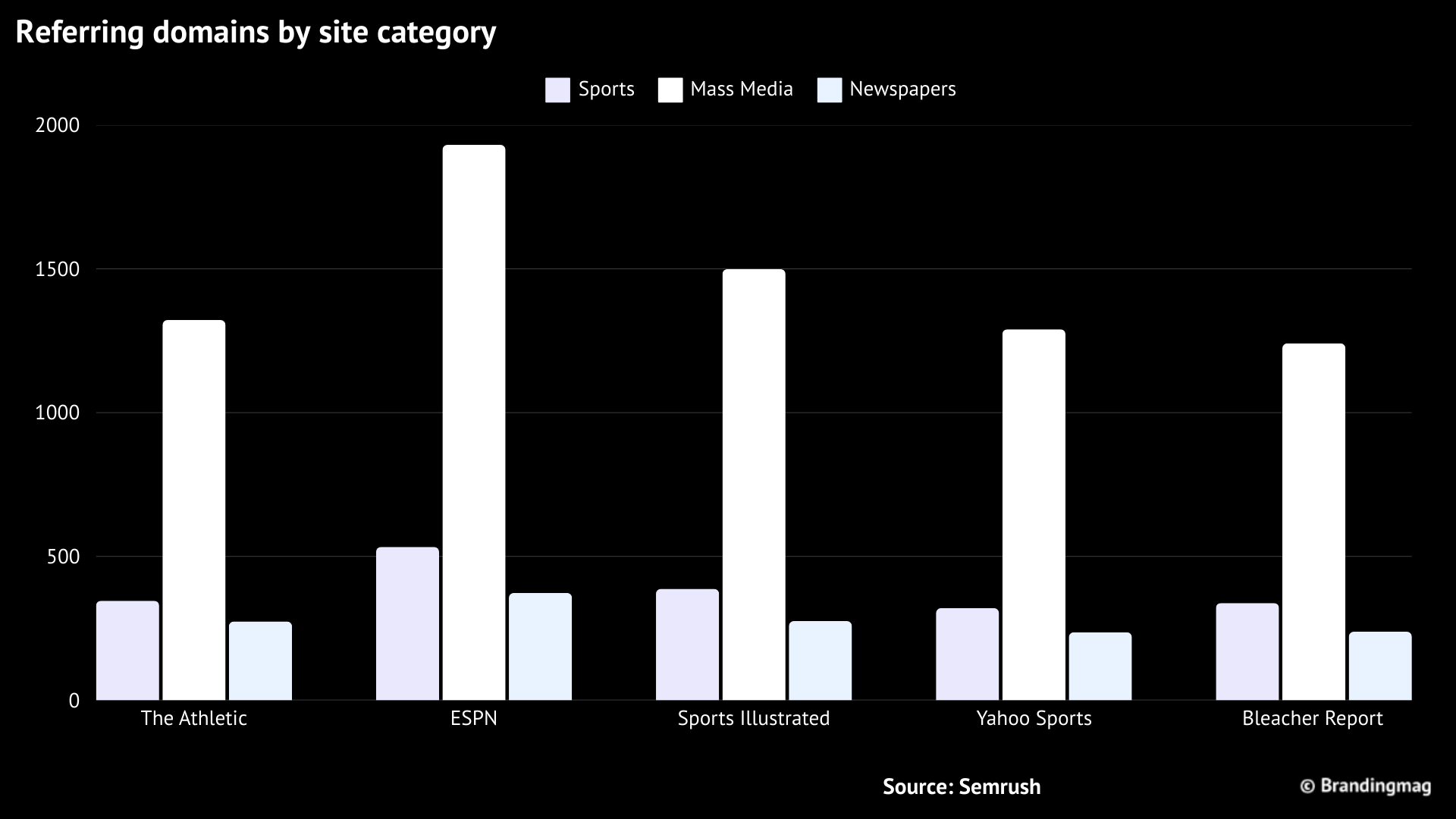 The pattern is consistent. The Athletic (and again, Bleacher Report) more than competes with the legacy brands. It has more mass media websites linking to it (i.e., is sourced more) than Yahoo Sports and Bleacher Report. Aside from ESPN, only Sports Illustrated has more sports websites and mass media websites linking (i.e., sourcing) The Athletic. Even ESPN has less than 100 more newspaper websites sourcing it via backlinks than The Athletic.