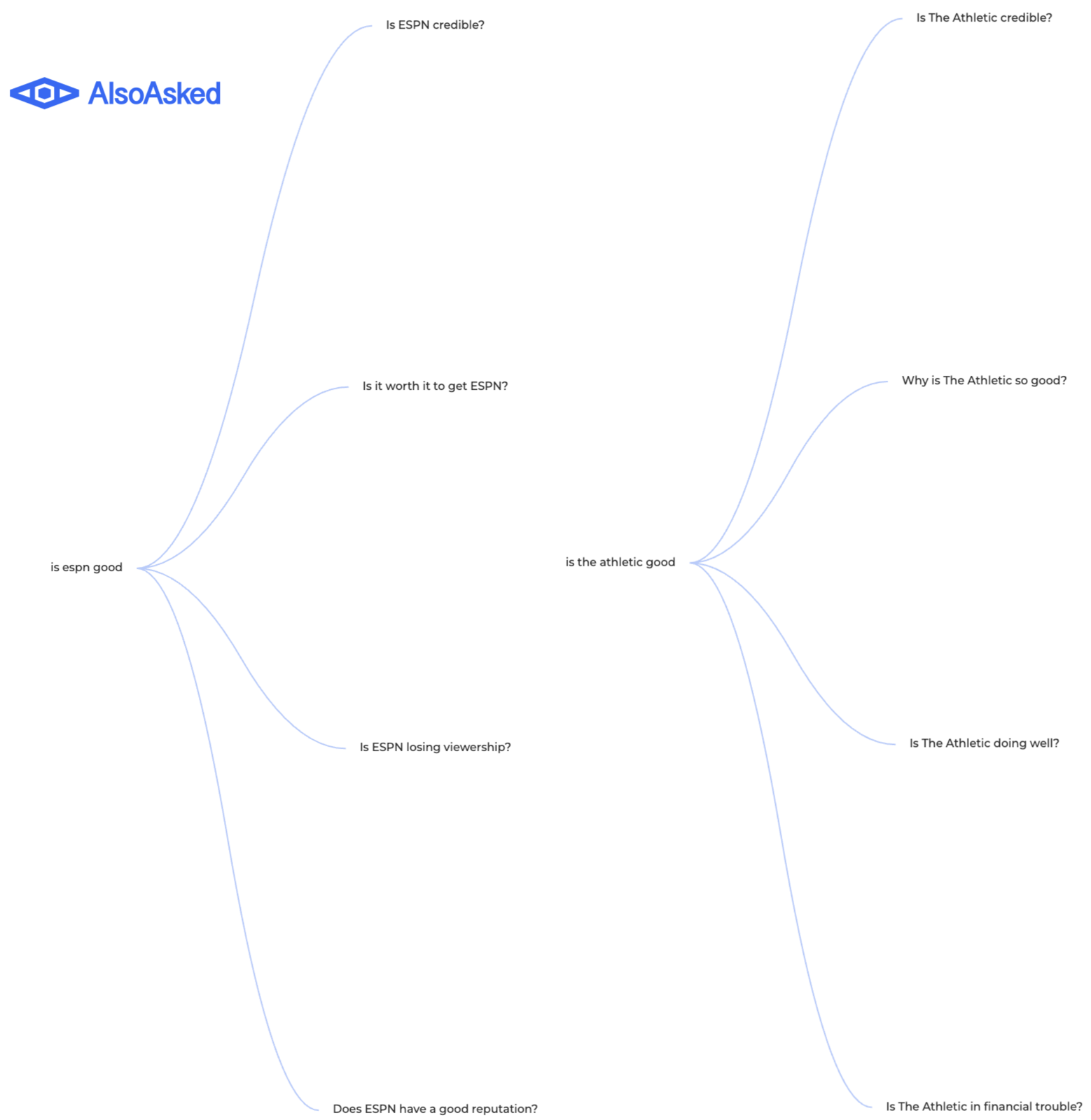 I ran the queries “is espn good” and “is the athletic good” through a tool called AlsoAsked that helps you mine this Google feature. There’s a very stark difference in the sentiment reflected in these questions.