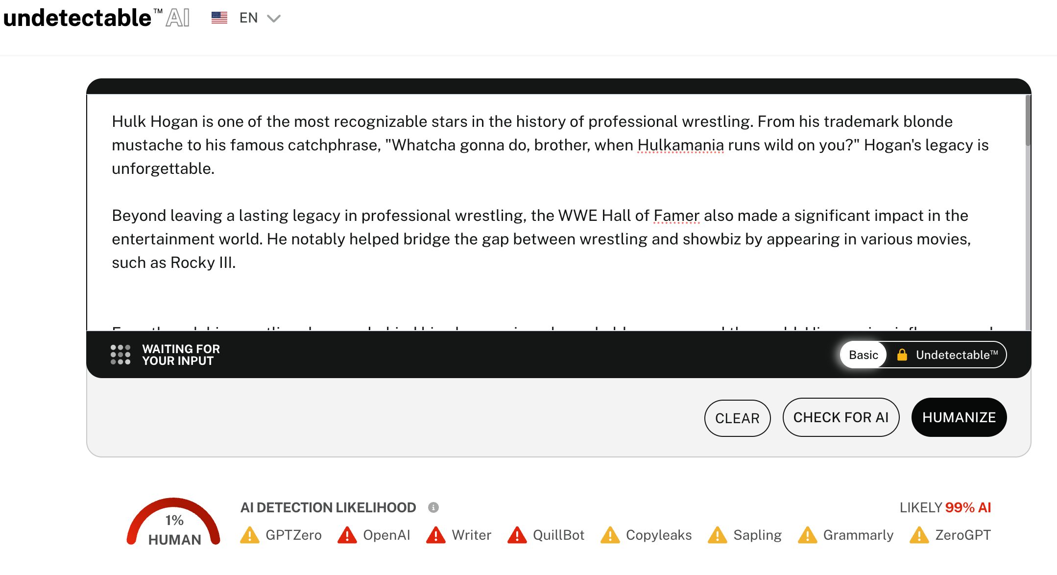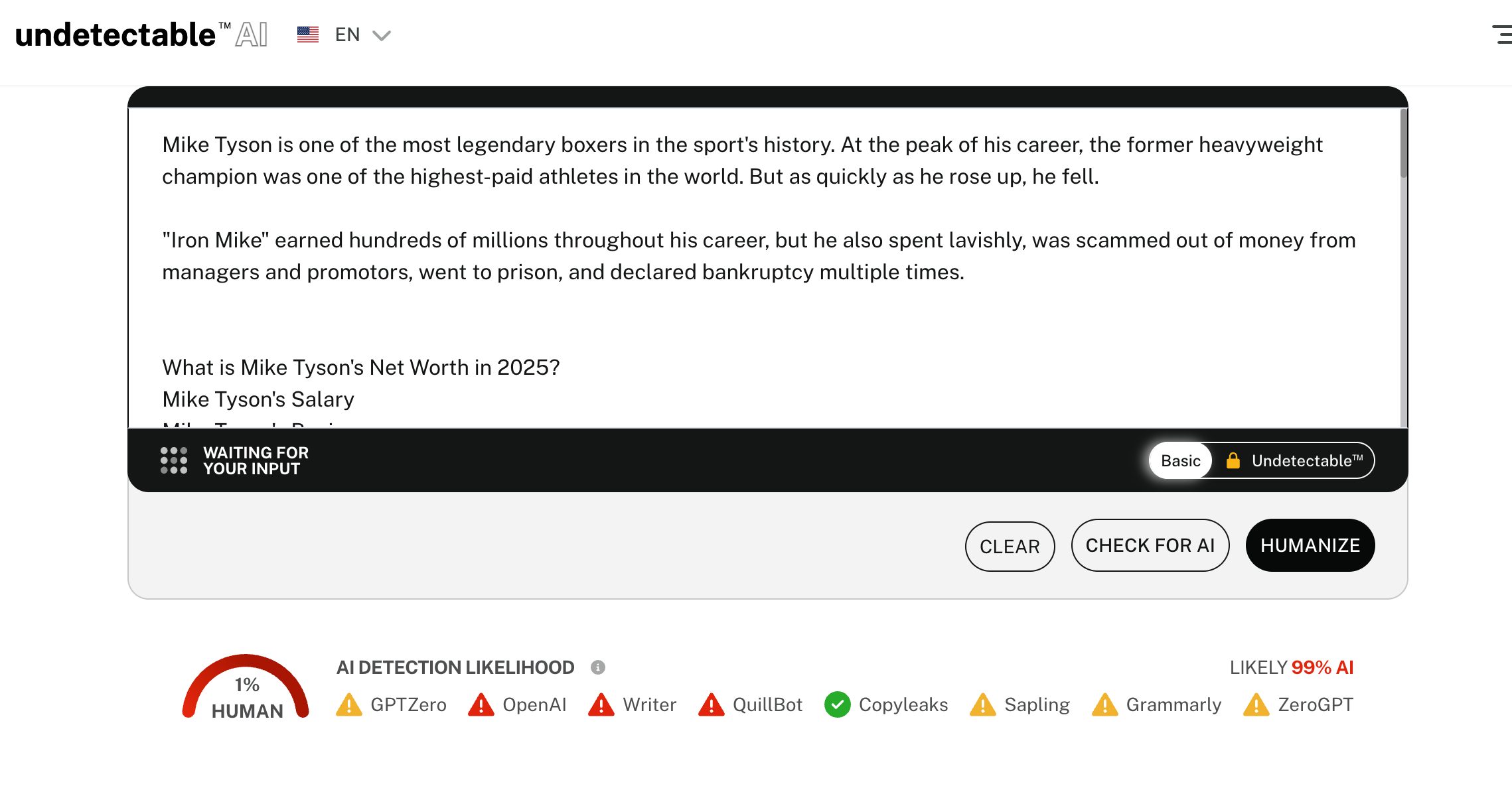 And the article in question is also not a one-off—it’s part of a bigger pattern. SI follows the same format for another article (also written for SEO, the way I see it) about Mike Tyson’s worth. If you remove the quotes, which again, I assume were only added to fool AI detectors, the results show the content has a 99% chance of being written by AI:
