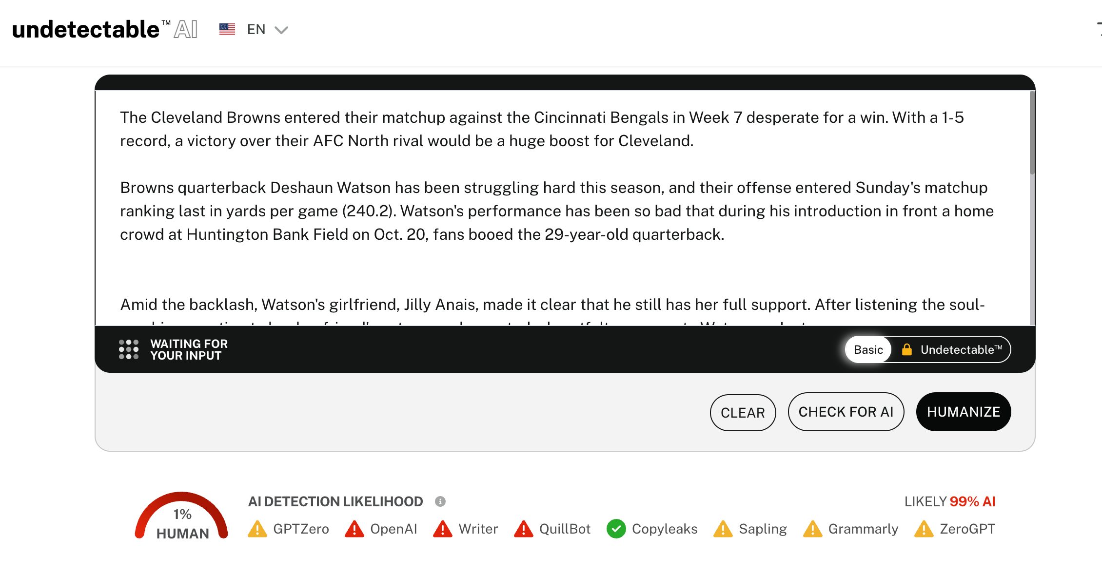 According to AI detection tools, Sports Illustrated is still possibly using AI to generate content. It doesn’t matter if the tool is accurate or not; you can still see in their articles how the outlet tries to get around detection, relying heavily on large sections of quotes to counteract the AI content used. It’s all a bit nefarious. To me, this is a bit nefarious, considering how the outlet tried to get around detection.
