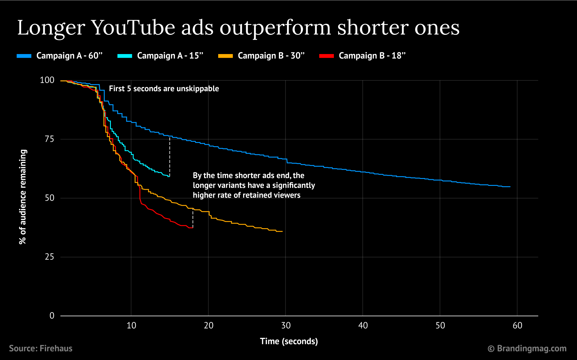 I was recently involved in a protracted argument with a media agency about including any ad longer than 15 seconds in a brand-building YouTube ads campaign. We eventually compromised with an A/B test. And guess what? The 60-second ad massively outperformed the 15-second one. So much so that if we had only used the 60-second ad, we would have tripled the time viewers spent with the brand after the YouTube skip button appeared. Click-through rates – while less important – were also better for the longer ads.