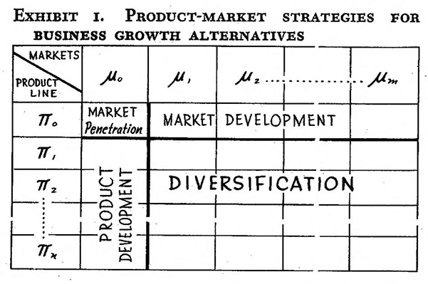 This idea is most famously captured in Igor Ansoff’s eponymous matrix, which he introduced in a 1957 article called ‘Strategies for Diversification’. Ansoff identified four basic alternatives for growing a business: increasing penetration; market development; product development; and diversification. Ansoff was particularly interested in the ‘unique problems’ posed by diversification, since this involves ‘a break with past patterns and traditions of a company and an entry onto new and uncharted paths.’