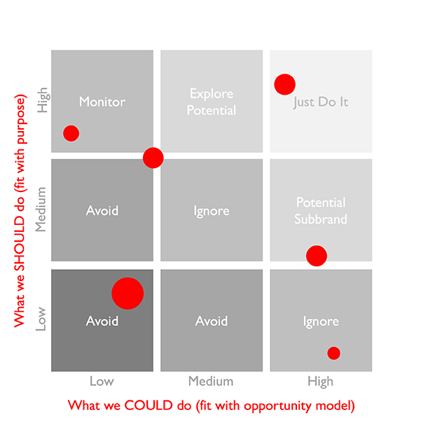 The majority of brand stretch opportunities are unlikely to be such obvious no-brainers: it’s more likely that some opportunities will fit well with your purpose, but only be of moderate fit with the opportunity model (in which case they are worthy of further exploration), or that others will fit well with your opportunity model but not so well with your purpose (in which case a subbrand could be a more appropriate way to stretch without diluting the brand). The matrix above can be used to map your entire portfolio: not just diversification opportunities but product line extensions, market developments and penetration growth opportunities. It can be used to map organic growth opportunities as well as potential acquisition targets. Most diversification opportunities are likely to fall short and this is where discipline becomes important: it’s better to invest in growing your existing business through penetration and EPD than stretching into areas that have only a weak chance of building your brand or your business.