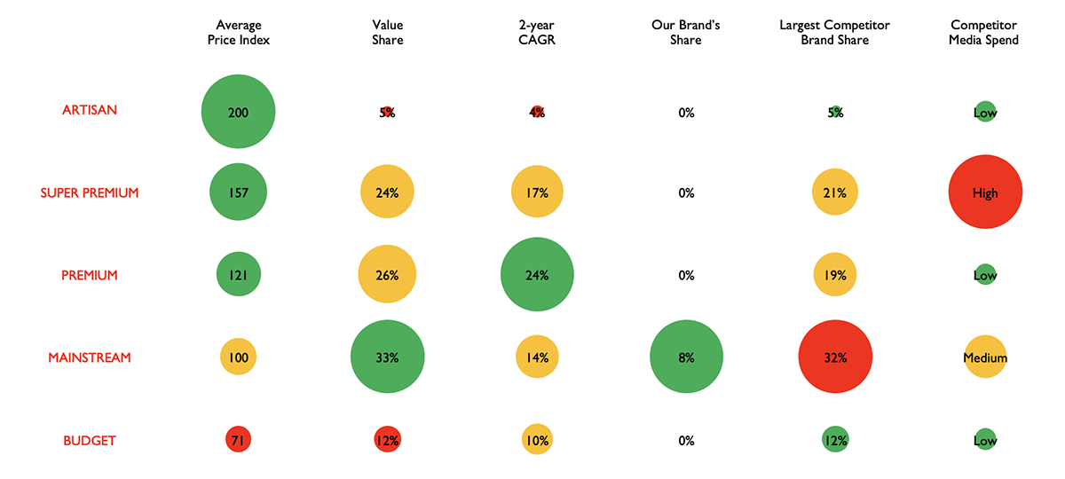 For each segment, the visual below indicates average price index (versus mainstream), value share of the total market, 2-year historical growth, segment share of the largest competitor brand and indicative competitor media spend. The ‘Our Brand’s Share’ column relates to our client’s brand: it has an 8% share of the ‘mainstream’ segment (far behind the segment leader, which has a 32% share).